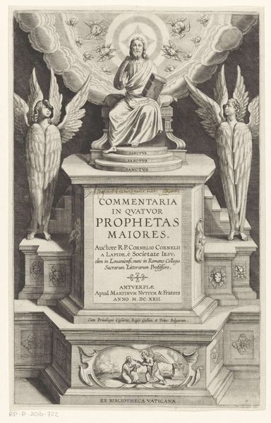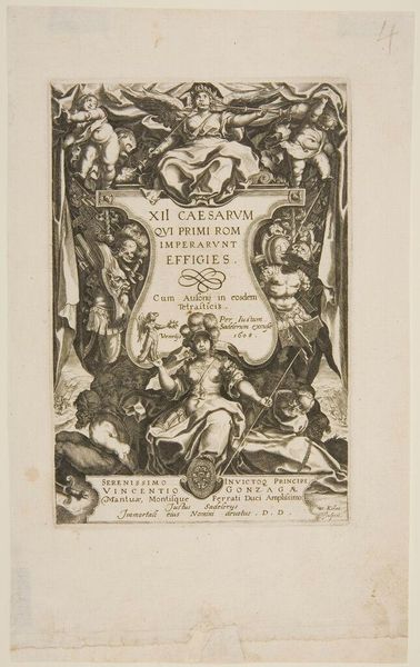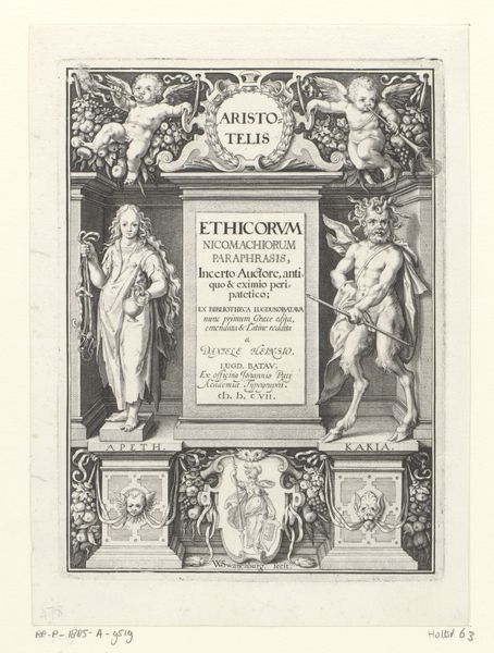 Editor: Here we have Jan Collaert’s "Title page for a series on the Passion, Death and Resurrection of Christ," dating from 1584 to 1587. It’s an engraving, currently held at the Rijksmuseum. I am struck by its balanced composition, almost architectural in its arrangement of textual panels and cherubic figures. What do you see as the primary elements at play here? Curator: The formal elements dictate its essence. Observe the crispness of the lines, achieved through engraving. This contributes to its inherent legibility and also guides the viewer’s eye systematically across the image. How does the central inscription strike you in relation to the surrounding figuration? Editor: The inscription commands attention, but it’s framed and almost softened by the cherubs. Is it merely decorative? Curator: Function, not just decoration. Notice the textual hierarchy achieved through varied letter sizes and the considered placement of the Medici coat of arms. This visual stratification is central to its success as a title page. How does this structural framework affect your appreciation? Editor: It’s as though the symmetry imposes a sense of order upon the chaotic narrative of the Passion. I initially thought the cherubs were saccharine, but they contribute to that structure too. Curator: Precisely. The formal arrangements amplify the inscription and create a balanced, comprehensible entry point to the story. Did you observe how the symmetry enforces balance of forms as well? Editor: Yes, each character being given the exact size. Thank you for guiding me through the analysis of this piece. Curator: It’s been a pleasure, this examination highlights the capacity of a formal approach to unlock new appreciations.
