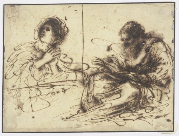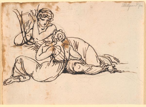 Ferdinand Bol rendered "Swooning Woman Supported by Two Figures" with pen in brown ink around the 17th century. Bol, an apprentice of Rembrandt's, captures a dramatic scene of a woman overwhelmed, perhaps by grief or illness, as two figures attend to her. In this sketch, we witness the emotional and physical vulnerability of the swooning woman, a theme often depicted to portray women in states of distress or fragility, in contrast to the active and assertive roles often assigned to men. The clothing of the two men who support the woman differ, suggesting diversity in social roles. Bol uses quick, expressive lines, conveying a sense of urgency and immediacy. The sketch invites us to consider the roles assigned to women in historical narratives, and prompts reflection on how these representations shape our understanding of gender, empathy, and care.