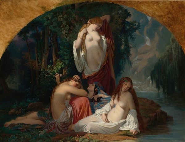 Herbert James Draper painted this untitled artwork using oil on canvas, a classic medium associated with fine art traditions. Observe how Draper uses layers of thin glazes to achieve luminous effects, particularly in the figures' skin tones and the shimmering water. This technique, while demanding, allowed for precise control over color and light, imbuing the scene with a heightened sense of realism and ethereal beauty. Draper’s engagement with classical mythology places him within a lineage of academic painting, where mastery of materials and techniques was paramount. The laborious process involved in creating such a work reflects the values of the art world at the time, where skill and craftsmanship were highly prized. Consider how the choice of materials and the artist's handwork contribute to the overall message and aesthetic of the piece. Understanding these material aspects allows us to see how Draper's work both participates in and transcends traditional categories of art.