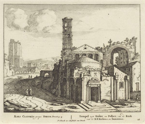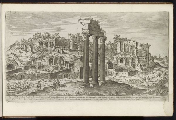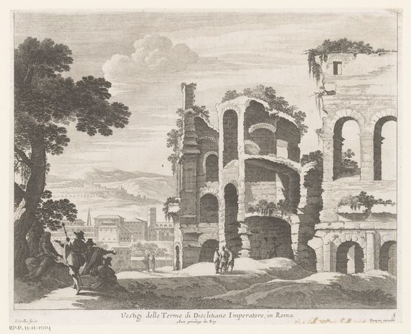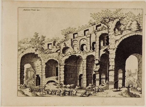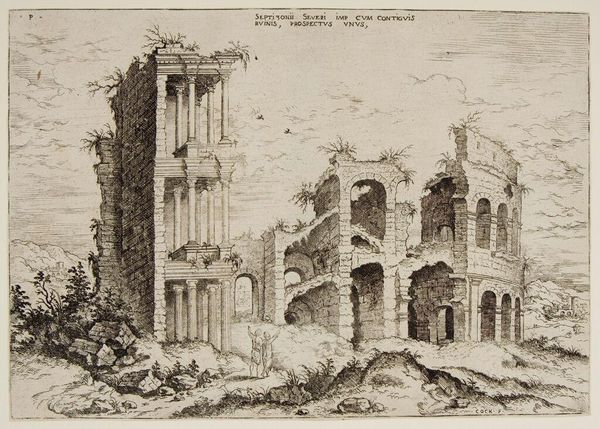 Editor: Here we have Hieronymus Cock’s print, "The Septizonium and the Colosseum," from around 1550. It’s fascinating to see these iconic structures rendered in such detail, but also… dilapidated. What stories do you think this ruinous state tells us? Curator: Exactly! It's a print depicting Roman ruins, but not just as they are; it's about the dialogue between past grandeur and present decay. Consider the historical context: Rome was still grappling with the aftermath of various sacks and political upheavals in 1550. What does it mean to depict these symbols of power in a state of ruin, overgrown with vegetation? Editor: I guess it shows how even the mightiest empires eventually crumble? Is it like a commentary on political power? Curator: Absolutely! It critiques the very notion of permanence and dominance. It raises questions about what societies choose to preserve and what they allow to fall into disrepair. The contrast between the decaying structures and the tiny figures in the foreground highlights human vulnerability against the backdrop of historical forces. It pushes us to confront our own impermanence, and perhaps, even question what structures of power *we* uphold. What kind of narratives do we risk erasing if we only value the "intact"? Editor: That’s a great point. I hadn't thought about it as actively questioning what's lost and whose stories are forgotten. Curator: And notice the vegetation, suggesting nature reclaiming what was once dominated by human construction. Think about the colonial undertones inherent in such domination of land and resources. Isn't it interesting that these romanticized ruins actually serve as cautionary tales about power, loss, and ultimately, about what we choose to value as a society? Editor: It definitely is! It completely reframes how I see this piece. I was so focused on the visual details that I missed the larger social commentary. Curator: Art invites us to engage, to question, and to consider perspectives beyond the immediately visible.