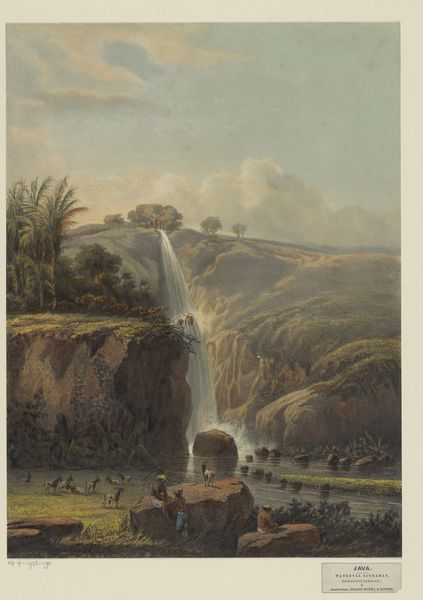 Curator: Seth Eastman’s watercolor, "The Laughing Waters Three Miles Below the Falls of St. Anthony," painted between 1849 and 1855, captures a fleeting moment of life near a powerful waterfall. It's a really interesting mix of observation and perhaps… a touch of something else. Editor: My first impression is… well, idyllic, almost deceptively so. The light, airy washes of color and the little vignettes – a hunter, a leaping deer – they soften what I imagine must have been a pretty overwhelming landscape. Curator: I think you hit on something there. Eastman, who was also a military officer, had unique access and a mandate to document Indigenous life. What we see, I believe, is nature perceived through that specific historical lens. Editor: Yes, the strategic act of framing nature itself. The waterfall becomes a romantic backdrop for the figure of the Native American hunter – his presence staged within a larger narrative of the "untamed" wilderness, as if placed there for a painting, forever pursuing. Curator: Absolutely, and consider the scale. That single figure drawing his bow at the cliff’s edge becomes the fulcrum point of wilderness versus civilization, rendered by very deliberate brushstrokes. Look at the loose flow in rendering that vigorous falls and compare with that solitary archer and bounding deer. It’s a story of conquest, maybe a subtle form of visual rhetoric of Manifest Destiny? Editor: The tension is in the romanticization of nature and also the potential for conflict embedded in that very staging. While Eastman seeks to portray harmony, there is that inevitable tension you identified arising from what we know to be the fate of America’s Indigenous population. That sense of impending sorrow tinges the bright beauty for me. Curator: Eastman's artistic project raises an interesting historical consideration on artistic production of his time. He, along with many artists like him, shaped not just representations but also, through their renderings, justified expansionist ideas and social dynamics, even without intending such an agenda. His choice of medium here creates an incredible intimacy while rendering a distant time and place. Editor: Right, “The Laughing Waters”… A name promising joy and lightness. But what kind of laughter is it, really? Is it the gleeful gurgle of undisturbed nature or something far more ambivalent – a last chuckle on the edge of transformation? Something to ponder on… Curator: Indeed. An artwork full of depth both intended and captured for the moment.