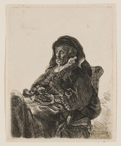 Editor: Here we have Louis Bernard Coclers's etching, Malle Babbe, created sometime between 1756 and 1817. There's a striking quality to the woman's face, a sort of jovial knowingness, contrasted by the owl perched on her shoulder. How do you interpret the symbolic relationship between the woman and the owl? Curator: Well, owls traditionally symbolize wisdom, but also darkness or folly, depending on the cultural lens. Here, I'm particularly drawn to how the artist positions the owl. Is it a familiar, a partner, or a commentary on the woman's perceived nature? Owls have strong symbolic links to the Greek goddess Athena, to wisdom and strategic battle. Are we meant to consider Babbe’s hidden attributes, beyond an initial glance? Editor: That's interesting. I initially read the owl as a symbol of oddity, maybe even isolation. But considering its association with wisdom, I wonder if Coclers is suggesting that Babbe possesses some unique insight or knowledge. Curator: Exactly. And what about the woman herself? What details stand out? Look at her laugh lines, her relaxed posture. She isn’t ashamed or hiding, instead meeting the world with what seems to be confident amusement. Coclers is possibly playing with contrasting cultural symbols to convey her emotional or intellectual states. Are there any archetypes coming to mind? Editor: Now I’m thinking about the wise woman archetype. There’s an element of societal disregard toward those deemed "other," and yet wisdom and experience can often reside in unexpected places. Thanks. Now I have a lot to think about! Curator: The cultural memory embedded in symbols often offers unexpected layers of understanding, right? Keep asking these incisive questions, and you will be going far.