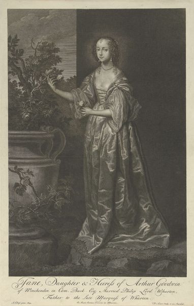 Pieter Schenk created this print of Mary II Stuart, capturing her regal presence in the late 17th or early 18th century. Note the deliberate inclusion of flowers, symbols of beauty and transience, beside Mary. Flowers appear in art history as vanitas symbols reminding viewers of the fleeting nature of life. Their inclusion alongside powerful figures like Mary adds a layer of contemplation. The presentation of rulers with such symbols isn't new. We can look back to ancient Roman portraits where emperors were depicted with symbols of power but also with reminders of mortality. This contrast creates a tension, a reminder that even the most powerful are subject to time. This evokes a potent emotional response, a deep-seated awareness of the ephemeral nature of existence. This use of symbols reflects a collective cultural understanding, echoing through centuries, reminding us of the inevitable cycle of life and decay.