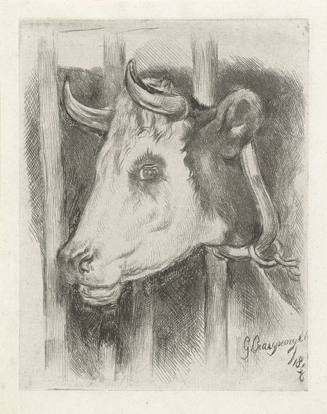 Editor: We're looking at "Head of a Cow," a pencil and ink drawing by Gijsbertus Craeyvanger, created in 1836. The detailed cross-hatching gives it a very serious, almost solemn, tone. What do you see in this piece? Curator: It's easy to view this as just a simple study of an animal, but let’s consider the socio-political context. The 19th century saw the rise of industrial agriculture, a shift that drastically altered our relationship with animals, turning them into commodities. Editor: So you see the portrait as maybe commenting on that shift? Curator: Perhaps. Notice how the cow is framed by the wooden structure, like an exhibit. Consider how Craeyvanger renders the cow’s gaze. There's a certain vulnerability there. How does that affect your reading? Editor: It does make me think about the power dynamics at play. The cow is confined, observed…it highlights our use of animals. It also could connect to current conversations around food systems and ethical consumption. Curator: Exactly. Think about the historical context of land ownership and animal husbandry and even how those practices contribute to larger questions of class and labor. The work becomes more than just an animal portrait; it's a quiet critique. Editor: I didn't initially see all of those layers, but framing it that way opens up so many new ideas. Thanks! Curator: It’s precisely those connections between past and present that keep art relevant and allow us to critically engage with the world around us.