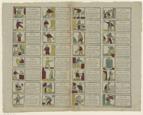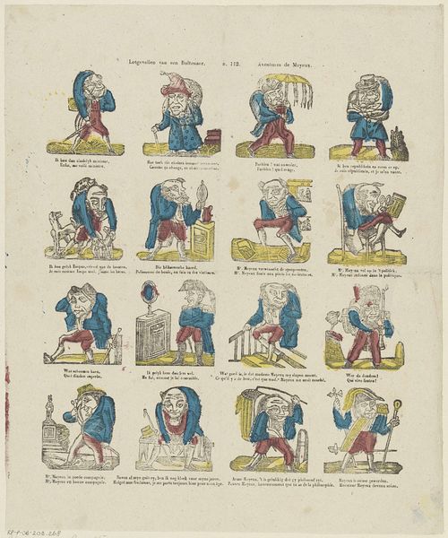 Curator: Allow me to introduce “Mr. Mayeux,” a work dating from 1827 to 1894 currently residing at the Rijksmuseum. The piece, employing drawing, print, etching, and pen techniques, is attributed to M. Hemeleers-van Houter. Editor: Oh, look at this quirky chap! It's like a sheet of satirical stickers. He reminds me a bit of political cartoons, like Honoré Daumier. So many scenes – all slightly absurd. Curator: Indeed. This falls within the themes of caricature and narrative art, also reflecting elements of genre painting. It really encapsulates the satirical vein that ran through much of 19th-century visual culture. Mr. Mayeux was a recurring figure – a representation of the bourgeoisie. Editor: A bourgeois everyman in little vignettes... Is this social commentary? Because it feels a bit cutting – this chap doesn’t exactly seem like a dignified portrayal of anything. Curator: Precisely! Mayeux functions as a figure onto which various social and political critiques are projected. Considering the rise of the bourgeoisie and the shifts in power dynamics during this period, the artwork comments on the perceived values, behaviors, and perhaps even the absurdities of the middle class. Think about class tensions, representation, and visibility within a transforming social order. Editor: Ah, so Mayeux isn’t just some silly guy being lampooned, but kind of a concentrated, exaggerated version of the ordinary man as society’s perception morphed? I dig that. It's fun on the surface but hides layers, just like those tiny cakes with all the frosting. Curator: Exactly! This seemingly lighthearted illustration, viewed through a contemporary lens, opens conversations about power structures, social mobility, and identity during its era. Editor: Well, that certainly elevates Mr. Mayeux from a mere amusing character study to a potent piece of cultural commentary. The artist created something pretty enduring. Curator: I agree. It reveals how artistic expression provides avenues to probe the nuances of social and political realities that shape society's narrative.
