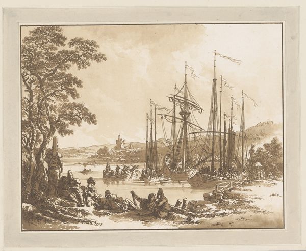 Editor: So, this is Richard Earlom's "Coastal View with the Landing of Aeneas in Latium," probably from 1776. It's an engraving, and it feels like such a romanticized view of history. What strikes you most about this piece? Curator: The historical context of this print is very important. It depicts a classical subject—Aeneas’s arrival in Italy—but it’s filtered through 18th-century eyes. Consider the fascination with the antique world during this era. Prints like these circulated widely, shaping perceptions of history. How does this inform the politics of imagery? Editor: I guess it makes sense that popular engravings would be a way to promote certain values. Like, the glory of Rome connecting to contemporary empire-building, or something? The grandeur here feels deliberately staged. Curator: Precisely. Earlom is not simply reproducing a historical event, he's constructing an idealised past. These works served a pedagogical purpose, displaying stories and ideals for a growing public increasingly interested in culture and education. Also, note the subtle ways nature is both a backdrop and a signifier of divine providence and Roman virtues. It promotes this classical subject to a wide audience that might not see the subject portrayed elsewhere. What values did the public at the time take away from it? Editor: Maybe ideas of destiny and rightful conquest? The way everything's bathed in a soft, almost divine light... it makes me wonder about the power dynamics embedded within images that are presented as objective representations of history. I definitely see that pedagogical purpose at play. Curator: And reflecting on those dynamics can really transform our reading of historical narratives presented in art.
