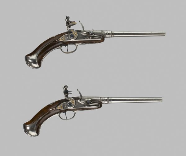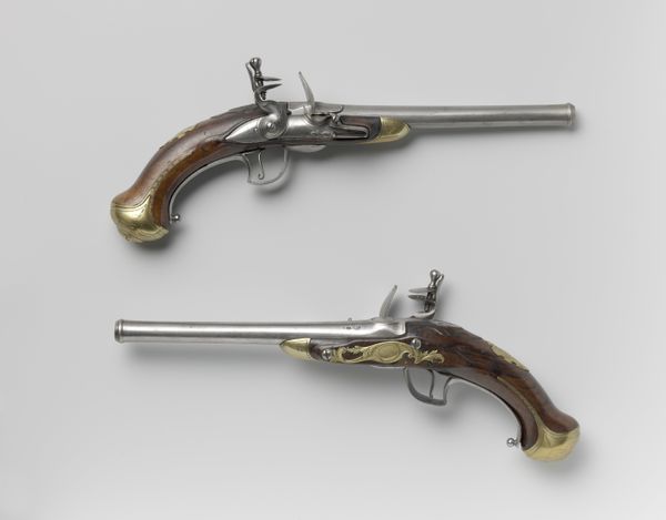 Curator: We’re looking at a pair of flintlock holster pistols, crafted between 1720 and 1730, currently residing at the Art Institute of Chicago, and attributed to the workshop of J.J. Behr. Editor: They exude a certain ornate menace, don’t they? The heavy gleam of gold against the dark wood. An odd coupling of opulence and the blunt reality of violence. Curator: The Baroque era truly loved ornamentation! These pistols employ metal, wood, and gold in lavish detail, exemplifying the period’s tendency to amplify even utilitarian objects into artworks. Beyond mere function, a holster pistol like this communicated status, power, and an assumed authority. Editor: The curvilinear design—the sweep of the handle, the intricate gold inlay—almost hides its deadly purpose. Look at the deliberate use of contrast; the warm wood against the cold steel, it’s quite calculated. Almost theatrical, wouldn't you agree? Like a prop in a deadly opera. Curator: Consider the holster itself, absent here, but part of the original design. Leather, often heavily tooled and ornamented, completing a powerful visual statement. Carrying these wasn’t just about self-defense; it was a pronouncement. It said something very distinct about its owner—often tied to rank or role within society. In those years, the act of bearing arms held many symbolic echoes. Editor: Yes, it whispers tales of courtly intrigue, power plays, and perhaps the quiet desperation of men guarding what they held dear. There's also the echo of craftsmanship, each line and curve meticulously shaped. I wonder what type of workshop created such pieces. Were artisans as concerned with balance and form as they were with functionality? Curator: No doubt, each craftsperson carried centuries of tradition. Understanding balance, metallurgy, and the symbolic language embedded in ornamentation was imperative to construct something with such both refined artistry and lethality. The weight of these objects echoes through history, bringing stories of power, precision, and social identity. Editor: Looking again, I find the artistry truly unsettling, merging beauty and potential harm so seamlessly. The object is not merely decorative but filled with intent. Curator: Exactly! And for me, tracing how those meanings shifted across centuries remains profoundly intriguing.