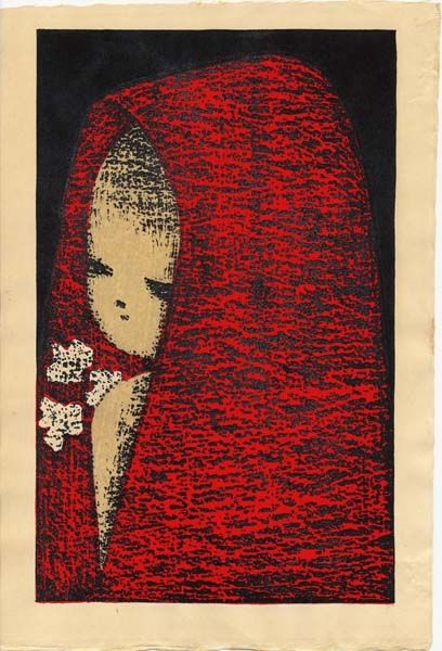 Editor: Kaoru Kawano’s “Child and Flower,” a woodblock print from 1950. There’s something incredibly haunting and tender about it. The bold red flower dominates the frame, almost engulfing the child. What story do you think this work is trying to tell? Curator: It feels like a whispered secret, doesn't it? Kawano often explored themes of innocence and the often-bittersweet transition into adulthood. I see the flower, that almost overwhelmingly vibrant red, as representing the intensity and perhaps even the potential dangers of the world. The child's muted palette and averted gaze… It speaks to a vulnerability, a certain reticence. Do you get a sense that the flower is comforting or overwhelming? Editor: I'm torn. The color is inviting, but its size is a little scary, like the flower could just swallow the child. Curator: Exactly! Think of traditional Japanese aesthetics, the concept of "mono no aware"—the pathos of things, a gentle sadness inherent in beauty. This work, to me, embodies that feeling. The child's connection to the flower isn't simply joyous; there’s an undercurrent of something more complex, a fleeting moment captured in time. And it also ties in nicely with the post-impressionist style, highlighting an emotional impression above realism. What a contrast to happy family portraits by someone like Renoir! Editor: So it’s not just a picture of a kid and a flower. It’s about… impermanence? Curator: In a way, yes. It is a moment in a bigger story that explores youth, the beauty of nature, but tinged with knowing. What will come of this moment, for this child? What future is coming? Editor: I definitely see that complexity now. I’ll look at woodblock prints differently from now on, especially in relation to other styles from the same period! Curator: Wonderful! Each work is a world of stories waiting to unfold.