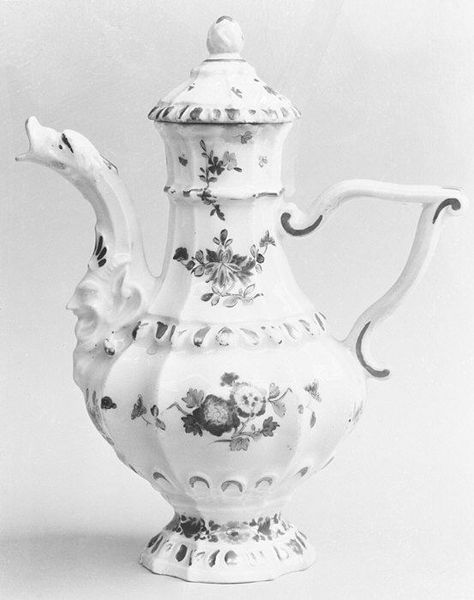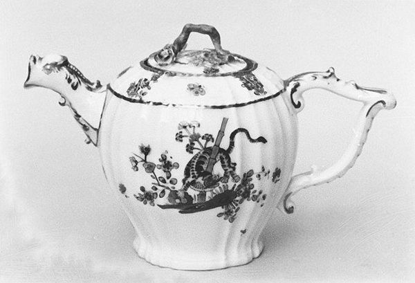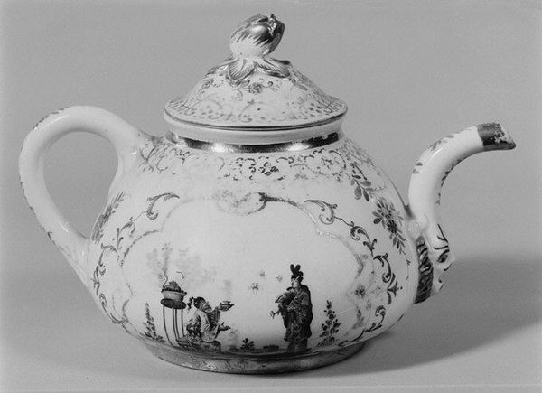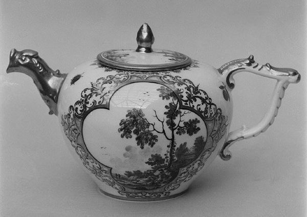 This covered bowl was crafted by the Meissen Manufactory, its precise date unknown. Note the bowl's rounded form, elevated by three sculpted feet, and crowned with a fitted lid. The decoration on the bowl emphasizes a structured arrangement. Around the base, a dense pattern of foliage creates a foundational layer, above which silhouetted figures and fauna play out a hunting scene. These forms are stylized, almost like theatrical cutouts against the bowl's pale ground. The lid echoes this motif, mirroring the scene below. This bowl destabilizes traditional hierarchies of art and craft. The silhouettes, reminiscent of shadow play, flatten perspective and challenge our sense of space. The bowl's design evokes a sense of playful artifice, inviting us to question the boundaries between decoration and representation. The bowl is not merely a vessel but a three-dimensional tableau, asking us to decode its narrative and appreciate the semiotic interplay between form and surface.