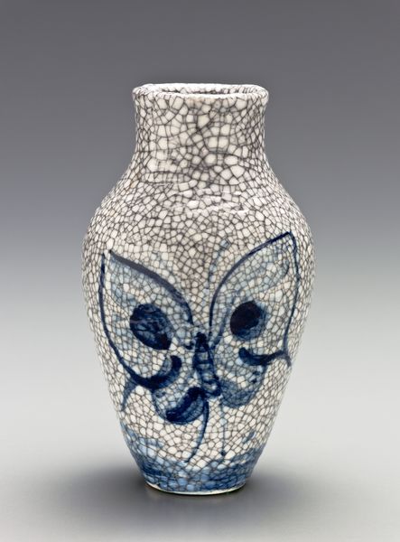 Editor: This intriguing ceramic piece, known as "Water Cooler," dates back to somewhere between 1870 and 1890. You can find it at the Metropolitan Museum of Art. I find the cobalt blue decorations so striking. It really captures a folk-art charm. I wonder... What initially grabs your attention about this water cooler? Curator: Oh, isn't it delightful? This isn't your mass-produced Tupperware water cooler, that's for sure! What strikes me is its exuberance – it’s almost joyful. The raised dots give it a tactile quality, like it wants to be touched. I can't help but think it could have been inspired by nature—imagine a quirky pufferfish rendered in ceramic, complete with a tiny ceramic watchman perched atop, forever on guard! Editor: A pufferfish, I love that. But why would someone dedicate so much artistic energy to something seemingly so functional? Curator: Well, it transcends mere utility, doesn't it? The time was late 19th-century America. The maker, listed only as Richard Franklin (Polk) Bell, was elevating something pedestrian to an object of beauty, injecting a bit of whimsicality into everyday life. In those days, craftspeople were challenging what qualified as art. It wasn’t just about portraits of fancy ladies! There’s also that sense of permanence, the impulse to make something that would endure, bearing witness to that moment in time. What do you think the artist hoped to say through his art? Editor: It's almost like a statement. The idea that even a water cooler could be a canvas, a reflection of their world. Thank you, that gives me much to think about! Curator: Indeed. I, too, feel refreshed with that understanding, don't you agree? A playful spin that only ceramics can deliver!