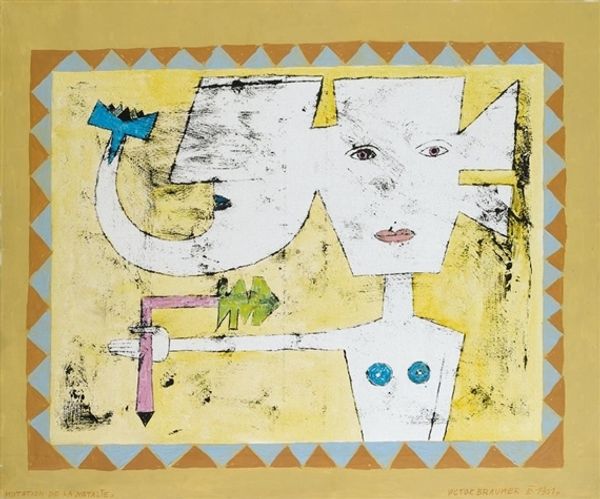 Curator: This artwork, titled "850A The Second Skin," was created by Friedensreich Hundertwasser in 1986, utilizing mixed media to explore themes of figuration. Editor: My first impression is, these guys are on their way to some very important, yet slightly awkward, hat convention. It's playful, but also… are they ghosts? Curator: Indeed. Hundertwasser's stylistic choices, with heavy nods to Art Nouveau and the Vienna Secession movement, embrace abstraction, lending a fantastical or even surreal quality to his figures. Note how the repetitive patterns serve as visual skins. Editor: Skins is a good way to put it! Those checkered patterns, the almost Seuss-like hats. There’s something delightfully anarchic about it. It feels like a rebellion against straight lines and expected color palettes. Even the faces look a little mismatched! Curator: Precisely! The composition leans towards caricature, distorting features and proportions. This approach emphasizes emotional expression and perhaps social commentary through distorted representation. Editor: Commentary, yes! The lack of clear differentiation, are they individuals or just extensions of this one collective self? This almost… regimented chaos makes me question how we all wear these social “skins” we are assigned. Curator: Analyzing further, you see how Hundertwasser used layers, depth is distorted, disrupting traditional perspective. He has collapsed fore-, mid- and backgrounds. Editor: It also has an air of pop art; though with more handmade warmth than industrial cool. He's taking something serious—identity—and treating it with levity. Are those even hands and feet on the figures. Are those moustaches real? Or tattooed?! It makes me feel, somehow, both unnerved and cheered up. Curator: A sentiment that echoes Hundertwasser's own philosophy that emphasized the integration of art with life and a deep respect for the environment. The mixed-media technique helps him build and create multiple dimensions. Editor: So in essence it seems "850A The Second Skin", wraps deep questions in cheerfully strange coverings. Almost… baiting you to look closer, but not take it all TOO seriously, know what I mean? Curator: I agree. It challenges conventions through the means of stylistic approach to form. Hundertwasser achieves complexity, simultaneously provoking questions about what lays beneath the layers.