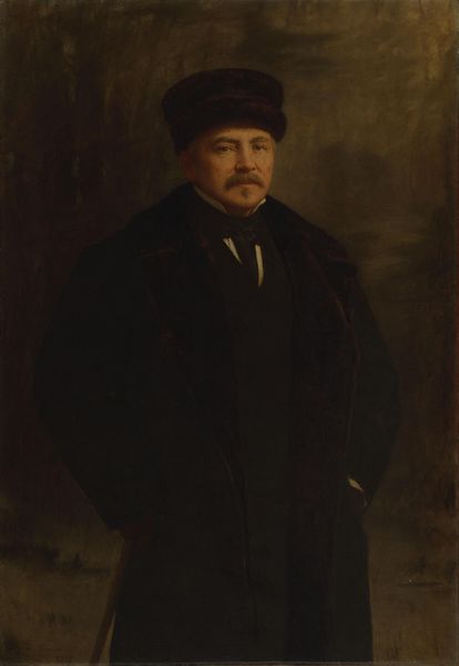 Editor: This is John White Alexander’s portrait of Thomas Nast, painted in 1887. It’s oil on canvas, and there's something both powerful and melancholic about Nast's gaze. What are your thoughts on this portrayal? Curator: I find this portrait fascinating because it places Nast, the influential political cartoonist, within a context of evolving American identity and political discourse. His gaze speaks of a man who both shaped and was shaped by the tumultuous Reconstruction era. Note his confident yet weary pose, symbolic perhaps of the weight of influence. Editor: It’s interesting you mention Reconstruction. How does his work at that time play into the portrait? Curator: Nast's cartoons often reflected and reinforced societal power structures of the time. Can you identify any symbols in this image that suggest ideas of authority, class, or social position? Editor: I see he’s holding a cane and wearing formal attire. Does that signify a particular status during that time period? Curator: Precisely. And consider the subtle critique inherent in portraying a figure known for skewering political figures within the traditional, almost romanticized, mode of portraiture. It raises questions about the complexities of power, representation, and even the artist's own role in shaping public opinion. Editor: It's amazing how much context a portrait can hold. Curator: Exactly. Art doesn't exist in a vacuum; it is intrinsically connected to the social, political, and cultural currents of its time. This portrait serves as a lens through which we can examine the power dynamics inherent to both the subject and the artist. Editor: This conversation has completely shifted how I viewed the work initially! Thanks!