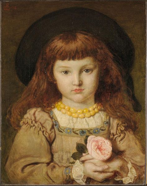 Curator: Here we have Piet Mondrian’s “Portrait of a Girl with Flowers,” painted around 1900. Editor: She looks like a porcelain doll about to shatter! So fragile, framed by that intense, almost claustrophobic red. Curator: The intensity you mention comes perhaps from the flowers. They surround her in the composition almost as a visual declaration of innocence and new beginnings. Editor: White roses usually signify purity, but the way they're painted—sort of smudged and indistinct—adds to this dreamlike melancholy. The light feels trapped. Curator: I find this quite a charming period in Mondrian’s evolution, you know? He's still embracing the softer edges of Impressionism and Romanticism. He would then go onto those hard-edged lines later in his career. The red you find claustrophobic—to me it is bold, but warm like a protective embrace. Editor: A protective embrace that also threatens to swallow her whole. And look at her eyes—they’re so big and searching. Children in portraits are so often stand-ins for something larger, for a nation's hope, maybe? The anxiety about preserving innocence—especially female innocence—was quite a symbol of its time. Curator: It is also about impermanence. Beauty, like a flower, fades and as an artist one must be aware of that truth. Editor: Makes me think of those late 19th-century photographs of children—the same almost unbearably intense gaze, aware of the camera, aware of being framed and presented. This painting echoes that strange sense of performance. Curator: He's capturing her at that precise moment, aware and yet…still free? Fascinating paradox that so many young girls seem to pose. Editor: Agreed, that strange mixture of posed perfection and raw, untamed feeling makes it feel both sentimental and deeply unsettling. I'm looking at her very ordinary, slightly puffy child's face which brings me back to reality. She seems so familiar and so remote at the same time. Curator: Well, I hadn't quite felt that level of anxiety you speak of, but you have definitely given me more to think about. Perhaps all art contains that paradox in one way or another.