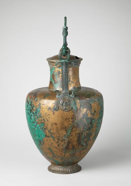 This is an Ancient Greek bronze pointed neck amphora with a stand, crafted around 450 BCE. The vessel strikes you with its symmetrical form: the ovoid body of the amphora rises to a narrow neck, counterbalanced by a flared stand below. The linear precision of the incised decoration contrasts with the unpredictable patination across the bronze surface. Geometric patterns radiate and encircle the vessel, their regularity disrupted by the mottled green and brown of the metal's oxidation. Consider the interplay between structure and surface. The ordered design, etched with deliberate lines, hints at a rational worldview. Yet, this order is visually unsettled by the materiality of the bronze itself, which corrodes over time in unpredictable ways. The result is an object that speaks to both the human desire for control and the inescapable reality of entropy. This amphora is not simply a container; it embodies a negotiation between form and chaos.