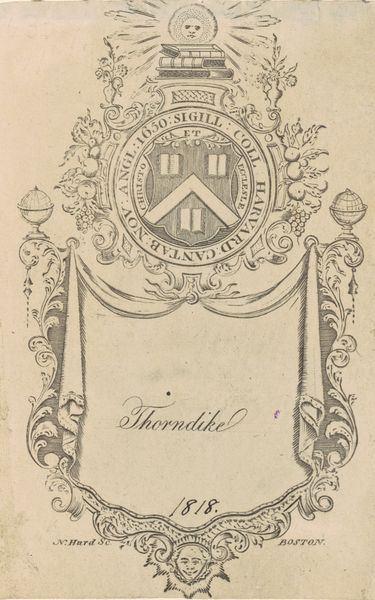 Editor: So, here we have the Harvard College Bookplate with the Christo et Ecclesiæ Seal, created in 1765 by Nathaniel Hurd. It's a print, a really detailed one! It reminds me a little of old maps, kind of…official looking. I’m curious, what’s your interpretation of this piece? Curator: Official, yes, but official with a twinkle! The severe formality is undercut by those sun faces, top and bottom, aren't they marvelous? One peeking over books, the other under what’s meant to be a serious institutional pronouncement. I always imagine them winking, almost mocking the gravity they’re meant to uphold. What does Harvard, for instance, actually mean when it uses the phrase "Christo et Ecclesiae?" For Christ and the Church...but what does THAT really *mean*, you know? What do you make of those cherubic fellas hovering around the shield? Editor: Good question. I guess, uh, those suns and cherubs were supposed to be common elements? Are they like saying, even the most official places can be bright and kind? The Christo et Ecclesiae, does it remind us of the historic bond that connects religion with educational institutions? Curator: Exactly! It also hints at the interesting relationship between those lofty goals and the... well, slightly silly, cherubic aesthetic. Like mixing your philosophy professor with a Renaissance postcard, you know? Hurd probably understood the visual language he was using but tweaked it just enough to keep things interesting, almost as a subversive comment, no? Editor: Subversive, hmm… so, this bookplate tells more than just about Harvard. I mean it’s both grand *and* kind of funny and reflective of social roots of higher education from that time. I never expected a bookplate could be so...expressive. Curator: And that, my dear editor, is the magic trick art pulls every single time.