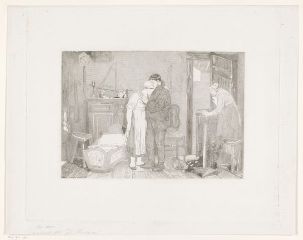 This print by François de Meersman presents an interior scene rendered in delicate lines and shades of grey, creating a sombre atmosphere. The composition centres on a grieving couple beside an empty cradle, evoking feelings of loss. The artist's meticulous use of line and texture creates depth and detail, contrasting the smoothness of the walls with the rough textures of the clothing and furniture. This contrast serves to emphasize the stark reality of their grief, set against the backdrop of a humble home. The scene is divided into distinct areas, each contributing to the narrative. The stark lines of the cradle and the doorframe create geometric patterns, that juxtapose the figures' emotional turmoil. De Meersman uses the semiotics of domestic objects - a ship model, an empty cradle, and a mournful figure in the doorway - to create a code that speaks to the fragility of life. The print's formal elements reflect the cultural and emotional landscape of its time, highlighting themes of mortality and despair. The artist does this while using the formal structure of the composition to enhance the artwork’s emotional impact and narrative depth.