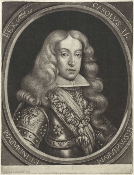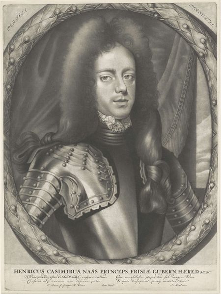 Curator: Here we have a portrait of Hendrik Casimir II, Count of Nassau-Dietz, likely created between 1675 and 1699. What's your first take? Editor: It strikes me as quite severe. The stark monochrome, the figure encased in armour – it evokes a sense of rigid formality and power, of course. It makes you wonder about the labor it took to craft that armor! Curator: Absolutely. The etching itself is fascinating when considered against the socio-political backdrop of the Dutch Golden Age. We're seeing the assertion of identity and authority. The sitter's class position reflected through the means available for such portrayals, and to maintain power via portraiture. Editor: Agreed. Consider the materials involved—the paper, the ink, the etching process. Each speaks to a level of artisanal skill but also to the Count’s investment in projecting this image. The production itself relies on the labor of others. Curator: Precisely. This wasn’t a quick snapshot, but a carefully constructed representation intended to communicate specific messages about his role, and legitimacy. We need to understand it against contemporary political and social dynamics, with class playing an outsized role for centuries in Europe. Editor: Right, the very choice to be immortalized in armour says so much about performative masculinity of the time, the intersection between power and material presentation is stark, even today. And how it's been mediated, reproduced, distributed as prints. What survives becomes the story. Curator: Indeed. The image would be circulated, reinforcing his power, perhaps quelling discontent or solidifying alliances. His likeness being presented so formally suggests his social position and personal self are completely intertwined. It's the gender and role rendered in a tangible item. Editor: Well, it definitely highlights how the creation and dissemination of art serves very specific social functions tied directly to power structures. It makes me reflect on how those systems of support and labor persist into our contemporary art world. Curator: Precisely, studying a portrait such as this can reveal just as much about its subject, if not more, regarding society as a whole, and the construction of these roles of power. Editor: Agreed, viewing art, whether we intend to or not, demands interrogation regarding social relationships as represented in objects and how deeply they structure our view.