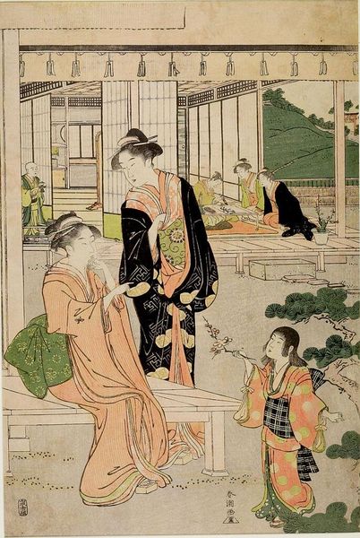 Curator: Katsukawa Shunchō’s "Garden Party" is a woodblock print, likely from the late 18th century, a time when the fleeting moments of pleasure were captured with such grace. What strikes you first about it? Editor: The tranquility! The ladies are poised, draped in elegant garments, and are seemingly lost in thought. It hints at hidden rituals and private moments within this cultivated landscape. Curator: Notice the arrangement of figures—they seem to be positioned according to their symbolic relevance. The woman with the branch is the most prominent, perhaps representing an intermediary between nature and the human sphere. Editor: The branch—an offering, a connection. Also, the text scrawled across the upper reaches might be hinting at the impermanence of these gatherings and the memories they create. Curator: The composition is subtly divided, creating this visual contrast between the figures. The artist emphasizes that beauty and art exist in a perfect union. Editor: I love the echo of art-making itself. A woman writing, another holding a branch – mirroring the artist’s act. It feels like a celebration of both creativity and natural beauty. I found some other interesting things in the picture, it has been a joy to look deeper.