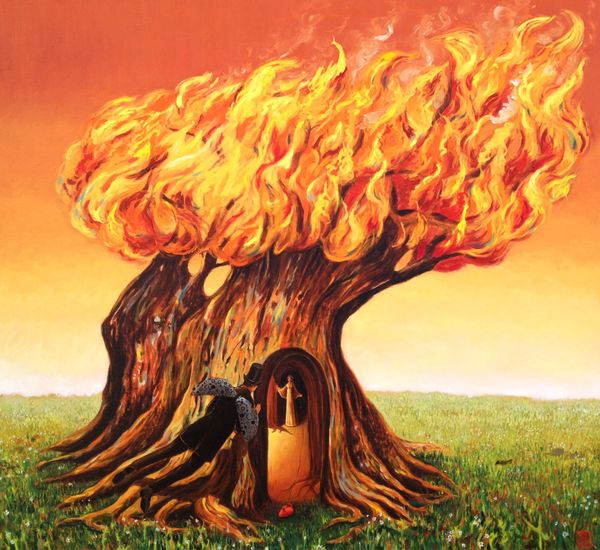 Editor: This is "For Want of a Nail" by Scott Gustafson, a fantastical painting, probably acrylic, showing a knight inspecting a horse's hoof, while battle rages in the background. The horse is huge! What a comical juxtaposition of the mundane and the epic. I am so curious about what you see here. Curator: Oh, I see a world steeped in the kind of "what ifs" that tickle my brain. The rhyme "For want of a nail..." speaks volumes. A kingdom lost all for want of a horseshoe nail! Gustafson brings that poem to vibrant life. But, darling, does it strike you as entirely doom and gloom? Editor: Not really, no. There’s something… charming about it. It doesn’t feel tragic. The knight's face is almost comical, like he's mildly inconvenienced more than devastated by impending doom! Curator: Precisely! There's whimsy woven into the fabric of it all. Notice the color choices, that star-spangled blanket on the horse for example. Gustafson isn’t aiming for historical accuracy. He's aiming for a storybook brought to life. Do you think the background war is even real? Or perhaps it is merely a nightmare caused by… a missing nail. Editor: Hmm, I hadn’t considered that. Maybe the battle's just a manifestation of the knight’s anxiety over this darn nail. Like, his internal struggle is being projected outward. I do think the almost hyper-real lighting makes everything seem unreal. Curator: And isn't that the power of art, darling? To make us question the "real," to weave narratives from the seemingly simple moments. This missing nail – a miniature black hole of potential disaster! That horse seems utterly unconcerned. I imagine myself in its head… perhaps that knight can do whatever he needs. As long as I am well-fed. What did you think? Editor: This definitely makes me consider the painting a meditation on priorities, a funny fable of cause and effect!