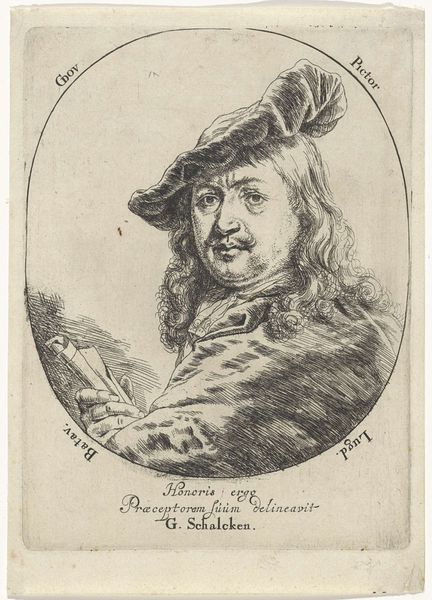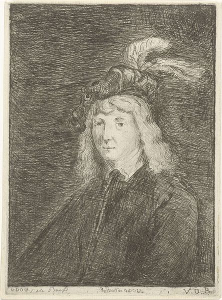 Curator: This drawing, housed here at the Rijksmuseum, is cataloged as a portrait of Gerard Dou, dating roughly from 1700 to 1725, and attributed to an anonymous artist. Editor: My first thought is: remarkable linework. The artist beautifully captures light and texture with what looks like red chalk. Curator: Indeed. Looking closely, we see an emphasis on capturing the likeness, but within a specific social frame. Consider the sitter’s garments; the elaborate hat and long, styled hair signal wealth and status in the Dutch Republic of that time. The drawing begs questions about class, power, and how they're visualized through portraiture. Editor: Absolutely, but let’s not forget the material reality. Red chalk was a favored medium for studies and preparatory sketches, cheaper than paint, so its use here possibly speaks to the process. It wasn't necessarily meant as a final, presentable image, but to document or to practice. Did this anonimous artist create this drawing as part of an apprentice or just for the purpose of his art? Curator: An important observation. Perhaps the 'finish' wasn't the priority; the immediacy of the sketch allows us access to a rawer depiction of a prominent man. It almost feels… vulnerable. This tension –wealth and status, depicted via what might be called simple means—offers interesting insight into the representation of identity at this time. Is this how artists represented this powerful identity? What was going on? What struggles were going on during that time that is expressed with simple materials and simple means of execution? Editor: And how available and standardized was red chalk around this period? Considering the access to and price of different materials often allows me to more closely align artwork with its context, connecting class, skill and the raw process of the act of making art. Curator: Precisely. Considering accessibility brings us full circle, revealing an intersection of artistic practice, subjecthood, and social standing. It forces us to reconsider historical binaries, bridging “high” art with labor and even perhaps gender when assessing creative contributions. Editor: Right. So even with this unsigned portrait done in a modest medium, we can glean something significant about the Dutch art world and society that shaped the work itself. The materials are never neutral. Curator: Anonymity isn't neutral, either. Who wasn't recorded and what was at stake for them at this time? Editor: A question for another time. Thanks.