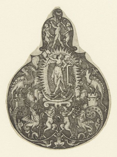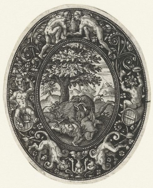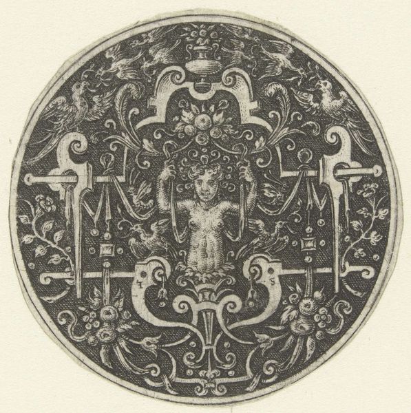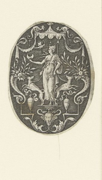 This oval woodcut print, "Jupiter met zijn adelaar aan zijn voeten," was created by Christoffel van Sichem II. The composition, dominated by stark contrasts of black ink on white paper, immediately draws the eye to Jupiter. He stands frontally, poised above his eagle in the center of the print. The dramatic play of light and shadow across Jupiter’s idealized physique exemplifies the Mannerist aesthetic. Sichem uses the graphic medium to enhance the lines of the figures. The repetitive, swirling patterns create a sense of dynamic energy. The formal arrangement divides the print into distinct zones, each filled with symbolic imagery that invites semiotic interpretation. The rigid symmetry creates stability, but is disrupted by the wilder, more organic forms, destabilizing the classical ideal of harmony. This tension suggests a cultural discourse about the challenges to traditional values and the emergence of new ways of thinking. The artwork's structure creates an ongoing interpretation and re-interpretation of established meanings.