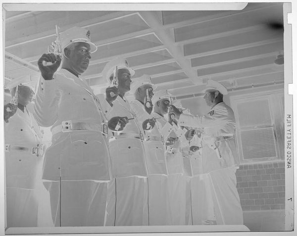 Curator: This is John Deusing's "Untitled (family portrait with three men in uniform)," currently residing at the Harvard Art Museums. Editor: It’s strikingly stark. The high contrast and almost ghostly figures give it a very formal, almost unsettling atmosphere. Curator: The uniforms certainly speak volumes. Notice how they signify not just military service, but potentially sacrifice and communal identity during a period of war. Family portraits held enormous weight. Editor: The composition is interesting. The subjects are rigidly posed. It gives a sense of forced formality, heightened by the stark lighting which renders details as pure form. Curator: The photograph might reflect societal expectations and perhaps anxieties of the time. The uniformity could represent social cohesion, but also a suppression of individuality under the weight of duty. Editor: Yes, though the light could also be seen as a tool to flatten the image, removing depth, and creating more visual impact through the negative space of dark and light. Curator: It provides a window into a specific moment, laden with historical and cultural significance. Editor: It's a fascinating dance between the visible and the invisible, a testament to the power of formal arrangement.