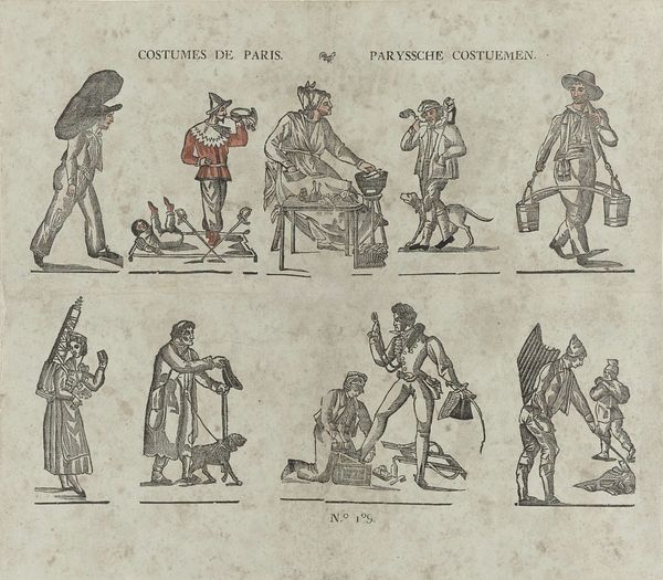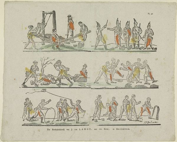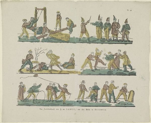 Curator: Welcome! Here we have a fascinating engraving called "Divertissemens du carnaval / Vastenavondsche vermaken / Convoi fun\u00e8bre de carnaval / Vastenavondsche lykstatie," made sometime between 1800 and 1854 by Erve H. Rynders. It’s currently held at the Rijksmuseum. Editor: Immediately, I'm struck by the layered composition, almost like stacked stages, each row presenting a different act within this carnivalesque scene. There's a delightful use of line to create form and movement. Curator: Indeed! This print offers us a window into carnival traditions of the period. Note how the imagery presents the Carnival celebration as a topsy-turvy world. Editor: Absolutely, the color, or the slight hint of it, leads my eye strategically. Red becomes a focal point, appearing on select figures across each row, tying them together visually amidst the chaos. Also, observe the use of symmetry and asymmetry that gives a certain rhythm to the scenes. Curator: Red here may stand for mirth and the passion of pre-Lenten revelry, though here there are some symbols of coming hardship during lent, visible in the funereal procession below, perhaps meant to warn against unbridled passion. What strikes you about that final procession? Editor: The shift in tone there is palpable, even with the limited tonal range. There’s a tangible heaviness in the figures' posture, a drooping quality mirroring the bare tree branches and subtly reinforcing a sense of conclusion and exhaustion, doesn't it? The contrast is very effective. Curator: It truly does evoke the sobering end of Carnival. But I feel it carries echoes of older "memento mori" traditions as well. The symbolism layered there tells me the procession is as much about life’s cycle as it is the Carnival's symbolic death before Lent's rebirth. Editor: Very interesting, thinking about those larger cycles! For me, I leave feeling grounded. Observing how Rynders utilizes these clear visual cues like that procession brings harmony and order to these layered depictions. Curator: Ultimately this small print gives us insight into what that moment felt like and how cultural ideas become physical realities. Fascinating indeed.