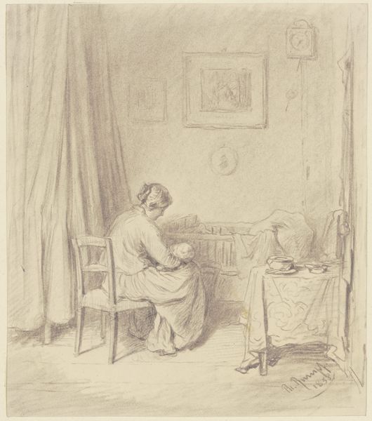 Curator: The artwork we’re observing is titled "Lili vil synge for en sou," which translates to "Lili will sing for a sou.” Created in 1861 by Lorenz Frølich, this piece is rendered in delicate pencil on paper. Editor: It's overwhelmingly delicate; the lines are so fine they seem almost ethereal. It evokes a quiet, contemplative mood—there's something almost sentimental about the scene. Curator: Indeed. Frølich, during the Danish Golden Age, often portrayed scenes of domestic life infused with narrative weight. In this, we see a young girl looking up to her mother as if negotiating the very concept of performance and compensation. What do you read from that? Editor: Structurally, there's a strong vertical emphasis; the bureau, the mother, the chair—all drawing the eye upward and contributing to that serene feeling. The paleness reinforces that delicacy, although it lacks robust form and instead blends to suggest something of ephemeral sentiment. Curator: Perhaps more than ephemeral, the narrative gestures toward economic realities embedded in childhood. Singing for money points toward a very specific kind of performativity, reflecting socio-economic dynamics within domestic spaces. It’s almost a visual ethnography. Editor: That verticality also directs our attention to Lili, whose form is subtly more distinct than the adult. There's a formal weight given to her by the contrast and texture—drawing a conceptual, aesthetic parallel that the work has been dedicated to her likeness in a world still marked by patriarchy. Curator: Yes, the gaze between mother and daughter encapsulates a whole spectrum of expectations and nascent awareness of social currency and even female expectations. There's an entire network of symbolic exchanges occurring here. Editor: For me, considering only the visual syntax, it's amazing how a piece rendered in such sparse materials can produce this full emotive narrative. Curator: A perfect example of how seemingly simple depictions of domesticity can offer deep insight into social dynamics through enduring images, yes? Editor: Agreed; now that you've pointed toward it, I understand there's considerable cultural value in a genre painting as ostensibly straightforward as this.