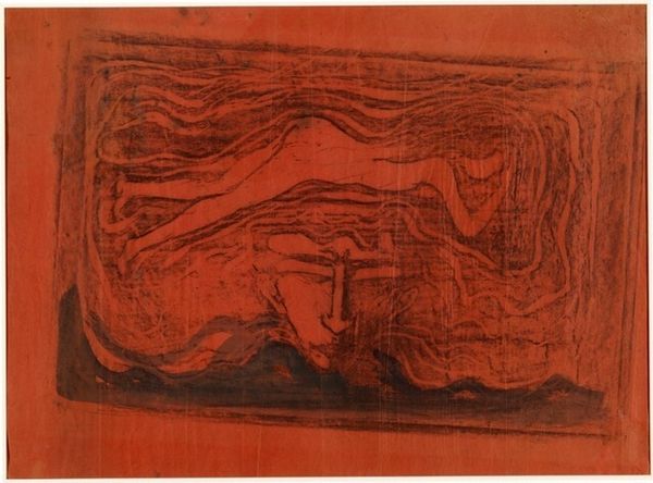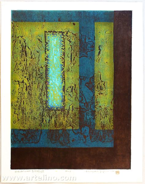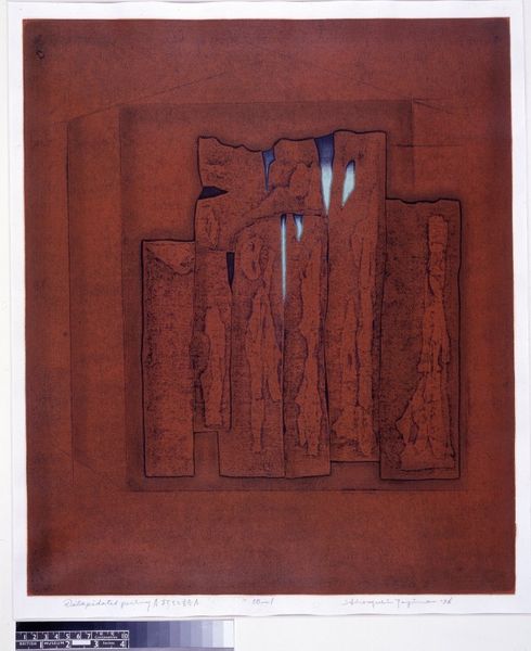 Editor: We’re looking at Hiroyuki Tajima's "Square" from 1969, created using mixed media including monotype and printmaking techniques. It has a strong geometric structure in browns and blues with an ethereal turquoise rectangle in the center. There's a kind of contained energy that makes me wonder, what does this carefully constructed arrangement signify? Curator: The square, throughout art history and across many cultures, often represents stability, the earth, the rational. Tajima sets up this expectation of groundedness with the deep browns and structured composition. Yet, he disrupts it. The torn edges and that bright turquoise panel inject a sense of the unexpected, a glimpse into something… transcendent. Do you see how that central panel almost glows? Editor: I do! It's like a window. Is that intentional? Curator: Perhaps. Consider how we often use windows symbolically: a way of seeing beyond our immediate reality. Here, the earth-toned structure might represent the limitations of the physical world. The glowing turquoise, resembling perhaps water or sky, then offers the potential for spiritual escape. What memories or emotions does that contrast evoke for you? Editor: It’s funny you mention water because that’s what I thought of at first. That maybe the earth-toned square contained an underwater world? The composition could represent containment or freedom, really. Curator: Precisely. And this ambiguity is crucial. Tajima is not dictating meaning, but rather providing a space for the viewer to project their own interpretations, informed by their cultural and personal experiences. It touches on something archetypal about the known and unknown. Editor: So, it becomes a personal reflection rather than a fixed statement. I didn't see it that way at first. It’s great to explore all these cultural perspectives to unlock different meanings!