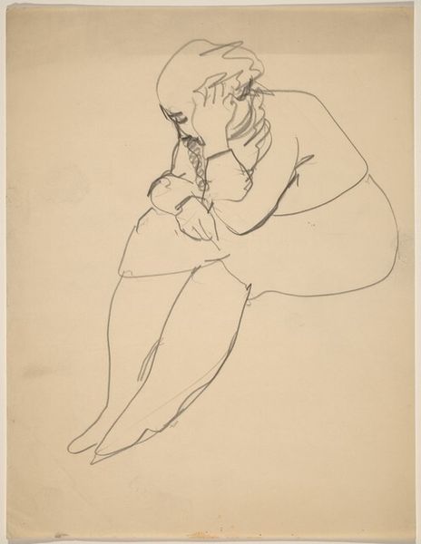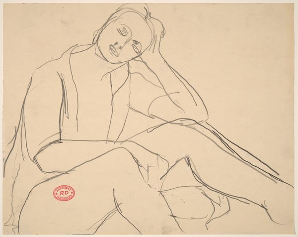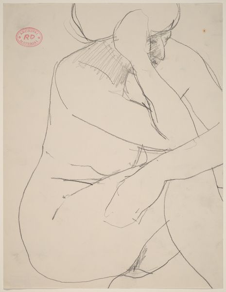 Curator: This drawing by Richard Diebenkorn, dating from sometime between 1955 and 1967, presents a female nude in charcoal on paper. The figure is seated, with her arms crossed atop what appears to be the back of a chair. Editor: There's a palpable sense of weariness or introspection conveyed through the woman's posture. The rough lines almost give the sense that she has been captured at an unguarded moment. Curator: Right, and it's worth considering Diebenkorn’s process here. The seemingly casual line work is very deliberate. His choice of charcoal allowed for easy reworking, a crucial element as he repeatedly re-examined the relationship between the figure and its surrounding space. Note how the negative space around her defines her form as much as the charcoal does. Editor: Absolutely, and one might also examine how Diebenkorn positions his subject within a history of female nudes. The gesture of the arms crossed above, supporting the head, hints at a negotiation of power. Is this meant to project agency or reveal vulnerability in mid-century representations of the female form? What dialogues does this figure spark regarding female experience during that era? Curator: Also important, the scale suggests the availability and accessibility of the materials themselves: this wasn’t an exercise in large-scale art production. Consider the market for drawings versus painting; this probably allowed Diebenkorn a more intimate relationship to production and possibly fewer external pressures from galleries or patrons. Editor: Which provides, potentially, a greater avenue to personal expression and perhaps a subtle revolt against the canon and patriarchal forces that were defining female beauty within art during this period. She is unglamorous, possibly even melancholic. Her body is rendered without overt sexualization. Curator: These drawings were part of Diebenkorn's continuous investigation of form and space—an underpinning of the Bay Area Figurative Movement. The gestural marks belie their carefully worked over quality. Editor: It encourages us to reconsider the common and accepted definitions of femininity prevalent during this period. It reframes conversations, and that makes it particularly potent, don’t you think? Curator: Definitely. Seeing how process intersects with the artist’s engagement and its reception shifts our appreciation. Editor: Precisely! It invites us to reconsider not just the aesthetic choices but the deeper sociocultural narratives woven into every line.