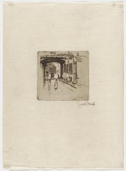 Curator: Joseph Pennell created this etching, "Covered Street," in 1883. It's a stunning cityscape example of the Impressionist style, currently housed here at the Minneapolis Institute of Art. Editor: Oh, wow! My immediate thought? Intimacy. I feel like I’m peeking into someone’s secret, sun-drenched afternoon. It's scratchy and unfinished in a good way. It feels… honest. Curator: That feeling of intimacy stems, I think, from Pennell's interest in portraying modern urban life in Europe, choosing these lesser-known streets rather than monumental buildings. There’s an informality that defies academic traditions. Editor: It does, and there is almost this feeling that the structure protects what it covers like it knows it will never last for an extended period of time. It has that fragile quality that only adds to its beauty. How was etching used at the time? Curator: Etching offered artists like Pennell a readily available and easily portable medium, suitable for the era's rapid social changes and increased urban sprawl. Its rise was facilitated by commercial printmaking and its connection to journalism and book illustration. Editor: Yes! It does feel very documentary in nature. Look at how he's captured that sunlight hitting the road. It dances, doesn’t it? It feels so temporal that its only purpose it to capture the exact feeling and tone that the moment exudes. Curator: The sketchy lines evoke an instantaneous moment. Pennell, of course, was deeply influenced by Whistler and, more broadly, the aesthetic movement, prioritizing sensory experience and artistic autonomy. "Art for art's sake," they declared! Editor: Totally! It looks as if he made every stroke purposeful and then took a quick picture as a reference later on in the studio. You can almost smell the dust and the heat rising from the cobbles. Makes me want to book a flight. Curator: It makes me consider the art world, then versus now: its players and purposes, the ever-changing meaning of representation. The impression it gives is always impacted by how its social and cultural milieu impacted what art was trying to represent. Editor: Well said! I think its honesty of vision and the almost offhanded feel is just as moving as any massive landscape or dramatic portrait. Small wonder it captures the eye!