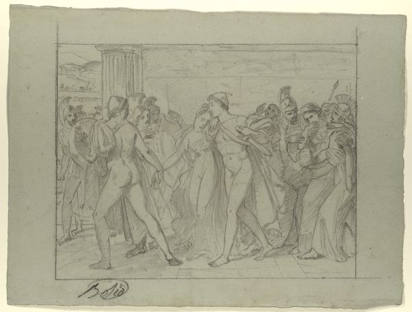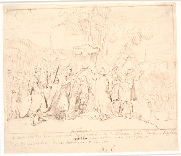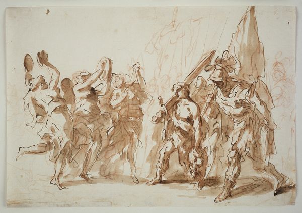 Editor: This is "Komposition med siddende konge omringet af n\u00f8gne figurer" – roughly, "Composition with a seated king surrounded by nude figures"—an ink drawing made by Nicolai Abildgaard sometime between 1743 and 1809. The monochromatic figures almost seem to be emerging from a dream. What can you tell us about this work? Curator: Look at how Abildgaard uses ink wash, the way he builds up tones... Do you see how the figures seem to coalesce around the enthroned king? His crown isn't just a symbol of power; it's an indicator of a divinely ordained status. Notice the naked figures, gesturing… Do you think they are adoring the king? Or perhaps they are imploring him? Editor: It’s hard to tell! Their poses are ambiguous, some reaching upwards as if praising, while others appear almost to be begging. And is that a carriage floating above them all? Curator: Indeed! Remember, this piece comes from a time of significant societal upheaval, right between the Enlightenment and the rise of Napoleon. Monarchies were being challenged, yet still held onto notions of divine right. What do you suppose a floating carriage, a vehicle for transit above it all, could symbolize within that context? Could it hint at aspirations, fantasies, or maybe an escape from earthly struggles? Editor: Perhaps it's about the desire for transcendence, for both the king and his people. Power but also escapism? Curator: Precisely! The drawing exists in this tension, where the earthly ruler is tethered to fantastical hopes. These figures are carriers of symbolic meaning, they repeat and reinforce certain cultural values. Editor: It’s amazing how much meaning can be packed into what seems at first glance like just a quick sketch. Thank you! Curator: My pleasure! Symbols offer layers of meaning that resonate across time and cultural contexts. Exploring how visual elements persist and evolve—that’s the joy of studying art.