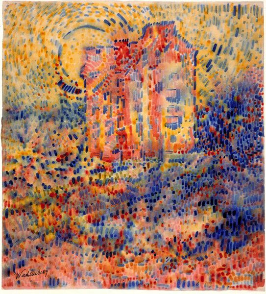 Curator: Sattar Bahlulzade’s “Ancient Fires of Surakhani,” created in 1971. An intriguing example of expressionistic landscape painting. What are your initial impressions? Editor: It’s incredibly energetic. The density of line and the pulsing red against the cool blues give it a frenetic, almost vibrating quality. Acrylic paint, yes? One can practically feel the physical act of its making through the swirls and strokes. Curator: Bahlulzade was working in a socio-political climate that demanded a certain adherence to socialist realism, yet he found ways to push boundaries. Note how the traditional architectural elements are deconstructed. It is a fascinating approach that allowed artists of his time to both address and subvert state mandates for "folk art". Editor: I find it captivating how the supposed landscape bleeds into pure abstraction. It reminds us that landscape painting isn't only about visual representation but about interacting with material, craft and also the socio-geographic factors. He presents the site's spirit rather than its strict appearance, creating a dialogue between the ancient sacred space and his contemporary world. The surface feels actively labored, a kind of built environment on the canvas itself. Curator: Surakhani has deep historical significance. An important monument of Baku. It was a Zoroastrian fire temple, a place of profound spiritual resonance for centuries, even before Islam. Bahlulzade isn’t merely depicting the site but evoking its energy and historical weight. The red evokes the perpetual flame of this sacred place. His art mediates between the tangible heritage of Baku and the symbolic power of Azerbaijan's past. Editor: And consider the context of acrylic paint itself. Its affordability and flexibility opened avenues for artists, democratizing the creative process. This choice allowed Bahlulzade to quickly and effectively capture this "spirit," breaking down traditional methods linked to wealth and artistic hierarchy. It suggests the democratized image of "folk art" accessible to all. Curator: Absolutely. He embraced the tools available and reshaped traditional subjects. What resonates with me is the visual assertion that even within a controlled ideological landscape, artists found methods to articulate their singular creative expression and preserve cultural memory. Editor: And for me, the compelling question lingers about materiality – its ability to bypass, to transcend imposed aesthetic conventions and offer profound new dialogues. Curator: Well said. A painting that offers much to ponder. Editor: Indeed. A captivating collision of land, labour and legacy.