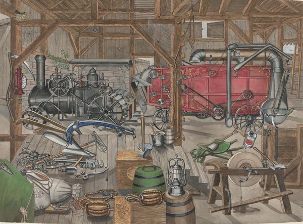 Perkins Harnly created "Japan" Lacquer Dipping Vat with watercolor, graphite, and crayon on paper. It's all about the lines here, a clean, crisp space delineated by precision, yet somehow warm, accessible. You get the feeling that Harnly was interested in the subject in and of itself, making the drawing a record of his encounter with it. The texture seems smooth, flat, like a blueprint or technical drawing, but the subject matter is so humble, the palette so restrained and muted, that it feels welcoming. Look at the way he renders the light in this piece, how it bounces off the silver vat and the metallic barrels. It’s not dramatic, but it gives the piece a sense of realism, of being in a real place. It reminds me a little of Charles Sheeler, who was also interested in industrial subjects, but Harnly's touch is softer, less monumental. Harnly shows us that anything can be beautiful if you look at it in the right way, and painting is about curiosity as much as it is about skill.