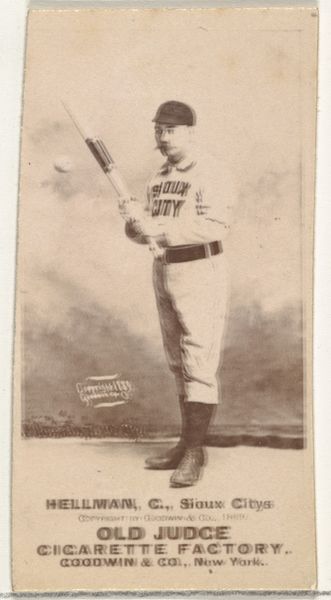 Curator: The piece before us is an albumen print, a portrait of Edward C. "Mouse" Glenn, a left fielder for the Sioux City Cornhuskers. It’s from the “Old Judge” series of baseball cards produced around 1889 by Goodwin & Company to promote Old Judge Cigarettes. Editor: The sepia tone gives it such a beautifully aged quality. I love how his pose and the faded backdrop almost give him this ethereal quality. It reminds me a little bit of vintage spirit photography. Curator: It's interesting you mention that. If you look at the compositional elements—the carefully considered pose, the lighting, and the soft focus—the formal presentation is absolutely about constructing a kind of... reverence. The photographic process in itself conferred status. Editor: Absolutely. This image isn't just selling cigarettes; it's selling the romantic idea of baseball and its players as heroes. Note his gaze; he isn’t looking at the camera. There’s something timeless about the determined set of his jaw. He embodies a sense of dedication and stoicism which is powerfully symbolic. Curator: I agree that his turned gaze directs the viewer to something outside of the image, thereby encouraging speculation, suggesting movement, which is an ingenious formal solution in a static, posed context. And, moreover, it mirrors a time where celebrity culture was still taking shape. To me, it says less about who he is and more about what role he fulfils. Editor: These baseball cards acted as a conduit of popular culture, helping to define masculinity, athleticism, and Americana itself at the time. We are invited into that world; consider the symbolism of the bat held aloft and how this man is placed ready to play his vital role. His stance and grip is representative of America itself poised ready to compete. Curator: It seems we converge on our points, while diverging on motivations and agency. I maintain, finally, that formal elements, photographic medium, tonality, texture, all combine in the photographic object itself. It constructs meaning from these elements as signifiers of class and intention. Editor: But I think it also speaks volumes about how we, over a century later, still grapple with our cultural heroes and icons of sport. Food for thought.