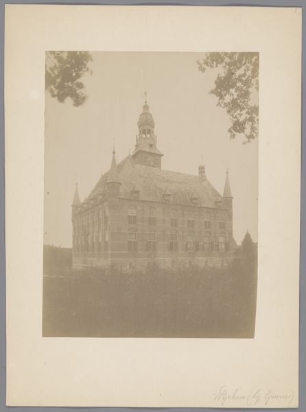 This photograph, "Noordzijde van Kasteel IJsselmonde", captures the north side of IJsselmonde Castle. Its sepia tones evoke a sense of historical distance and the muted palette emphasizes the castle's solid form and austere geometry. The composition, with the castle centrally positioned, underscores a sense of symmetry. The architecture is defined by clear, vertical lines and right angles. This is only interrupted by the conical turrets on either side. The scaffolding that obscures the roof is a semiotic marker that speaks to the ongoing dialogue between preservation and transformation. While the photograph documents the structure, it also invites contemplation on how architecture embodies ideas of permanence, history, and place. The photograph's formal qualities create a stillness, and the scaffolding subtly destabilizes the sense of timelessness by pointing to an ongoing intervention, reminding us that even the most imposing structures are subject to change and interpretation.