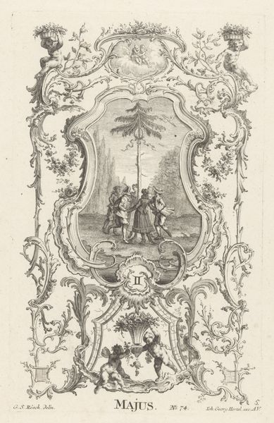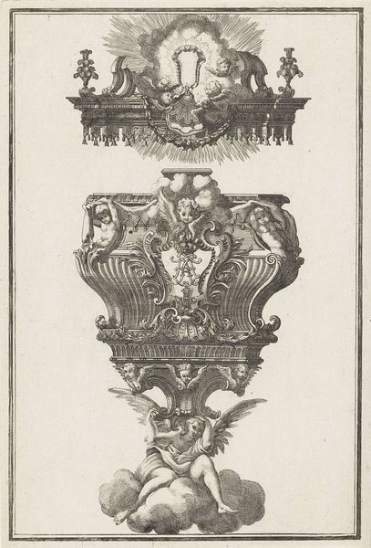 Curator: This pen drawing is entitled "Omlijstingen met schilderende figuren en muziekinstrumenten," which translates to "Frameworks with painting figures and musical instruments." It's an interesting piece, dating from between 1678 and 1724. Editor: It's immediately striking. The density of the line work creates this almost dizzying, ornamental effect. So intricate, yet strangely stark with the blank space within each frame. Curator: Indeed, Johann Christoph Hafner, the artist, uses these open spaces quite deliberately. These meticulously rendered frameworks, with their array of allegorical figures and instruments, were likely intended as spaces for personalized emblems or dedications. Editor: Right, so each framework acts as a stage for societal theater. You've got these stoic figures in classical dress, various musical instruments hinting at performance, all framing emptiness... Were these used for announcements, perhaps? Or declarations? Curator: Potentially. It speaks to a world of ordered presentation. Consider how Hafner emphasizes symmetry and balance within each individual framework; it speaks to Enlightenment ideals of clarity and reason. Even the shading suggests form conforming to function. Editor: And the masks. Don't forget the omnipresent theatrical masks interspersed in each frame, some cherubic, others downright grotesque! It emphasizes that performative element even further. Perhaps this reveals some societal tensions. Is this optimism tempered with a wink and a nod? Curator: A valid point. It does suggest the coexistence of grand narratives and underlying skepticism. Hafner, through the very deliberate arrangements and juxtapositions, acknowledges these dueling perspectives. Editor: So the pen becomes an instrument of record, but also an interpreter of cultural nuances, using these figures to reveal something about the era's public image. The emptiness becomes a prompt for interpretation in itself. Curator: Precisely. And in its totality, we perceive a dialogue between social expectation and private introspection, cleverly embedded in the interplay of figure and ground. Editor: It offers us so much to contemplate! The societal pressures within decorative structures, perhaps! Curator: Exactly, something to muse about long after this recording concludes!