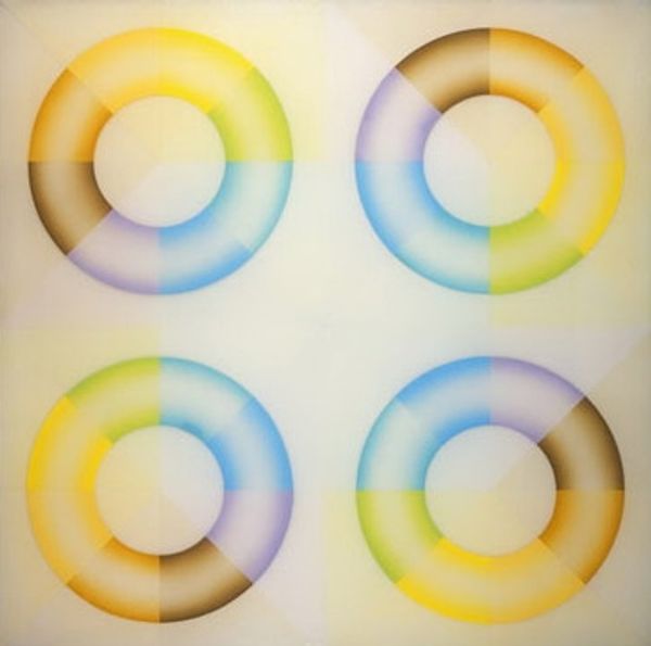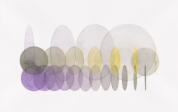 Editor: This watercolour on paper is called "Yellow to grey and grey to purple and yellow to grey movie - grey to yellow and purple to grey and purple to black and black to grey movie - purple to grey and grey to yellow and purple to black movie [left panel]" and was created by Olafur Eliasson in 2009. I find the overlapping circles really create a sense of motion. What do you see in this piece? Curator: The use of watercolor and the sequential circles trigger my mind to wonder about the cultural symbolism inherent in the color gradations and implied movement. Circles, of course, represent cycles, time, continuity. Think of mandalas, ancient astronomical charts, or even a basic clock face. The colour shifts could mirror emotional states as well – do these progressions have personal or universal resonance, would you say? Editor: I guess the transition from yellow to grey, then to purple and back, could suggest cycles of hope, then neutrality, and maybe a touch of melancholy? But the lightness of the watercolor keeps it all pretty airy and abstract. Curator: Precisely! Eliasson often engages with perception and natural phenomena. Watercolors, in their fluid nature, amplify that connection. Does the gradient evoke for you the memory of a sunrise, sunset, or perhaps the fleeting quality of light during different times of day? This kind of symbolism gives us clues. Editor: I see what you mean. The ephemeral washes remind me a lot of atmospheric changes. It’s interesting how the medium and the geometric shapes combine to hint at such complex ideas. Curator: And by contemplating that synthesis, we tap into the collective reservoir of meanings embedded in images throughout human history. It is an artwork's invitation to engage. Editor: I will keep all that in mind when observing similar work in the future. Thanks!