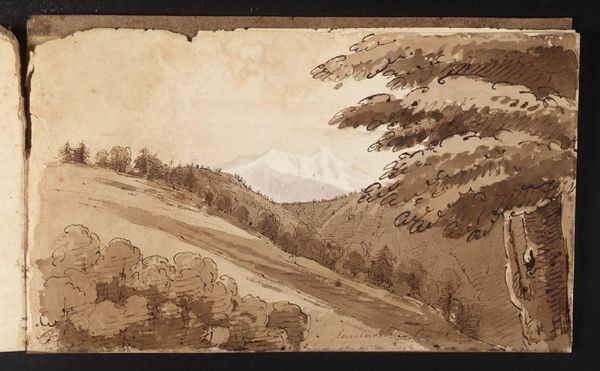Editor: Here we have "Alpine Landscape," a watercolor and drawing attributed to Friedrich Salathé. I’m really struck by its unfinished quality—the contrast between the detailed trees and the sketchy foreground creates an interesting tension. What can you tell me about this piece? Curator: This unfinished quality speaks volumes about artistic practice and the market forces at play. We see plein-air techniques being employed here. Note the detailed rendering of the foliage. To me this work offers insights into Salathé’s labor and the consumption of landscape imagery during his time. Editor: So, you're saying the materials and methods give us clues about the culture around the work? Curator: Exactly. How does the use of watercolor impact the speed of production compared to, say, oil painting? What implications does that have for Salathé's income? Think about the social status associated with landscape art during the Romantic and Realist movements—how does that affect who can commission and consume such work? This wasn't just about representing nature; it was about turning nature into a commodity. And consider the implications of rendering the landscape for emerging tourist markets. Editor: I see. The "unfinished" quality makes me realize it’s not just about a pretty scene; it is about how the landscape becomes something to consume. What is it, do you think, about watercolor that allowed a material change in landscape artwork? Curator: Watercolor's portability lent itself well to creating souvenirs or preliminary sketches for larger, more "important" works. The speed with which one could capture a scene made landscape as material available to wider markets. Think about how this affected Salathé's status as a landscape painter during that period and beyond. Editor: That gives me a lot to think about; I definitely see this artwork differently now. The context around the work transforms our appreciation of its aesthetics. Curator: Precisely! Focusing on materiality shifts the conversation away from purely aesthetic judgments and instead invites an examination into production and consumption.