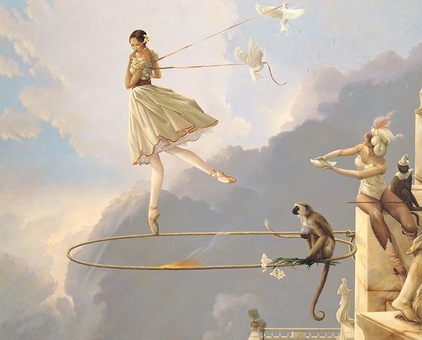 Ernie Barnes created this compelling painting, Two-on-Two, with a striking elongation of figures set against a dramatically clouded sky, which immediately draws you into its world. The figures’ exaggerated limbs reach upwards towards a makeshift basketball hoop, embodying the spirit of striving and competition. Barnes plays with form by distorting the human anatomy. These aren’t just figures playing basketball; they are symbols of the reach for achievement. The unusual proportions and the dynamism of their poses invite us to consider how representation itself can be stretched and molded to convey deeper meanings. The artist seems less interested in a literal depiction of basketball and more focused on what it represents in terms of ambition, struggle, and community. The dark and light interplay in the clouds and the figures' attire adds depth, further emphasizing the thematic tension between aspiration and the grounded reality from which these figures emerge. This formal technique of exaggeration challenges our notions of realism and asks us to think critically about the stories we project onto images.