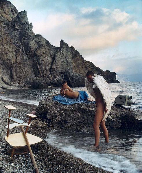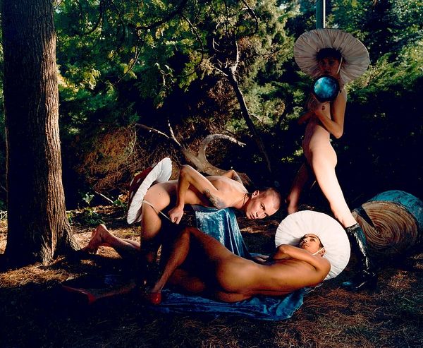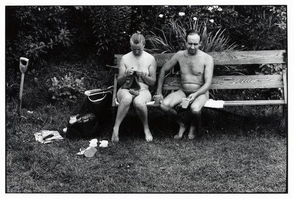 Curator: This is a photograph by Shellburne Thurber, titled "John Having His Portrait Painted". Editor: The light is striking; it creates a real sense of languor, almost voyeuristic in its intimacy. Curator: Indeed. Thurber’s work often explores themes of identity, representation, and the act of looking. The setting—a lakeside dock, perhaps—adds a layer of relaxed self-awareness. Editor: I am captivated by the unfinished portrait itself. The artist capturing the subject, who is also vulnerable and exposed. It's an interesting contrast. Curator: The juxtaposition of the classical portrait and the modern, casual setting invites a dialogue between past and present. It questions how we create and consume images today. Editor: There is definitely something timeless in this image of artistic creation and human contemplation. Curator: Absolutely. Thurber prompts us to consider the social dynamics inherent in the act of portraiture. Editor: An enduring image to consider.