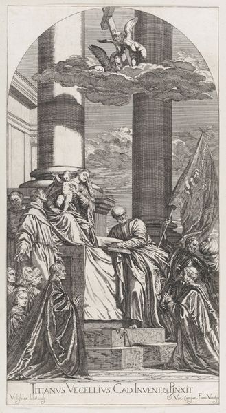 "Visitatie" is an engraving made by Valentin Lefebvre in the 17th century, after a painting by Paolo Veronese. It depicts the biblical scene of the Visitation, where Mary, pregnant with Jesus, visits her cousin Elizabeth, who is pregnant with John the Baptist. Engravings like this one played a crucial role in disseminating artistic ideas at a time when access to original paintings was limited. Lefebvre, as an engraver, was thus an important interpreter of Veronese's work for a wider audience. Note how the architecture in the background situates the scene in the artist’s contemporary world. The encounter between the two women is a powerful moment of recognition and shared experience, laden with religious significance and feminine solidarity. The use of elevated vantage points and classical architectural elements emphasizes the importance of the women’s roles. Lefebvre's engraving captures the emotional and spiritual dimensions of the Visitation, inviting viewers to reflect on themes of faith, motherhood, and divine purpose.