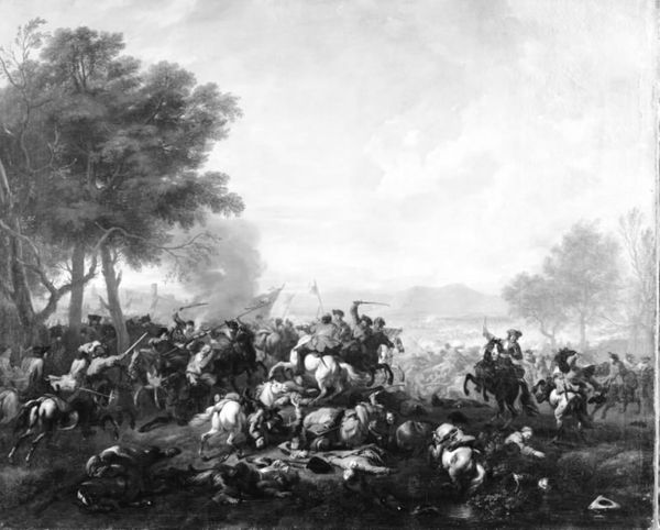 Johannes Lingelbach created "A Beach" with oil on canvas. Its dimensions are a modest 14.4 by 22.2 centimeters. The subdued palette of grays and browns creates a sense of quiet industry. Lingelbach arranges the figures and animals in a composition that pulls the eye from the lower left across to the building on the horizon. The arrangement of the elements within the frame guides our perception. The low horizon line emphasizes the expanse of the sky, where the structural use of light and shadow suggests depth. The figures and animals are not merely placed on the canvas but are structurally integrated, their forms echoing and balancing each other. The buildings in the background are strategically positioned to lead the viewer's gaze and create an interplay between near and far. Lingelbach’s work highlights how formal qualities can serve as the primary conveyors of meaning. We are left to contemplate not just what is depicted but how it is depicted.