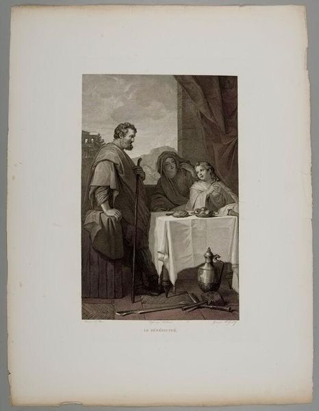 Curator: Carl Heinrich Rahl's "The Virgin in a Landscape" offers a softly rendered devotional scene. I'm immediately struck by the delicate gradation of tones and the circular composition. Editor: The medium seems well-suited to the subject; there's something almost fragile in the way the ink sits on the paper, which seems pertinent to the idea of the Virgin. Curator: Indeed. Notice how Rahl uses the circular format to frame the figures, guiding the eye toward the Virgin's contemplative pose. This compositional choice underscores her spiritual serenity. Editor: And the material itself contributes to the reading, it seems almost like the light etches the image into being, as if the divine is immanent in the very process. Curator: The contrast between the light tones on the Virgin and the darker tones of the surrounding landscape does amplify the sacred. Editor: It all feels very much of its time. I'm left wondering about the hands that pulled the print, about its original context, and about the place for this image in the world. Curator: A compelling point. The formal elegance, however, reminds us of the enduring power of such refined compositions. Editor: Absolutely, and by considering production, we can better appreciate the layers of labor inherent in this seemingly simple print.