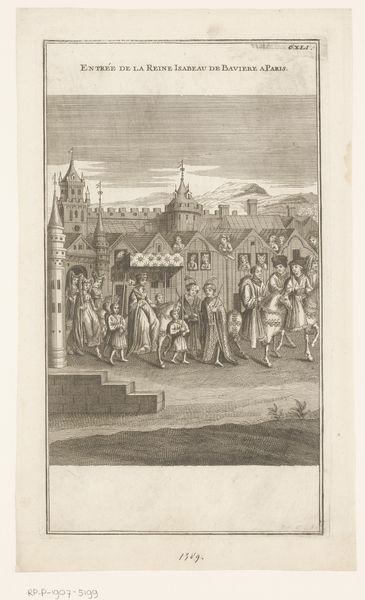 Curator: Today, we're looking at "Prins en Prinses van Oranje op de kermis te Middelburg, 1786" by Mathias de Sallieth, created around 1786 to 1787. This print, a detailed engraving, captures a street scene in Middelburg. Editor: It's a fascinating piece! My immediate sense is that the composition creates an overwhelming sense of civic festivity, full of movement. Curator: Indeed. Let's examine the structure. Note the strong diagonals formed by the awnings of the market stalls, contrasted with the verticals of the architecture. This opposition creates a dynamic, if somewhat chaotic, sense of space. Editor: For me, it evokes a very specific cultural moment. Flags are a very potent signifier here: The prominent display of the flags likely signals patriotism, Oranje’s position within the cultural memory of the Dutch identity, don’t you think? Curator: Unquestionably. And it seems calculated, wouldn’t you agree? It serves as a direct emblem of authority carefully positioned in the upper right quadrant. Do you observe any other formal aspects in de Sallieth’s process here? Editor: He certainly seems concerned with creating an almost journalistic documentation of the cityscape itself, emphasizing realism and detail with a careful play of dark and light in this city street celebration. Curator: His attention to depth, achieved through careful gradations of shading, makes that very believable! I might emphasize how this contrasts with a more stylized rendition of figures that seem purposefully more generic and less individually detailed. Editor: That seems a subtle statement on individuality and the place of citizens within an organized and, ostensibly, benevolent nation-state, right? Curator: Precisely! Perhaps de Sallieth is even alluding to the careful relationship between leaders and citizenry. Editor: That could be! Overall, there’s a kind of visual delight that offers some hints at some tensions beneath the celebratory surface. Curator: Thank you! Exploring its visual language truly illuminates a fascinating narrative. Editor: My pleasure. And recognizing the layered symbolism unlocks historical understanding, I think!