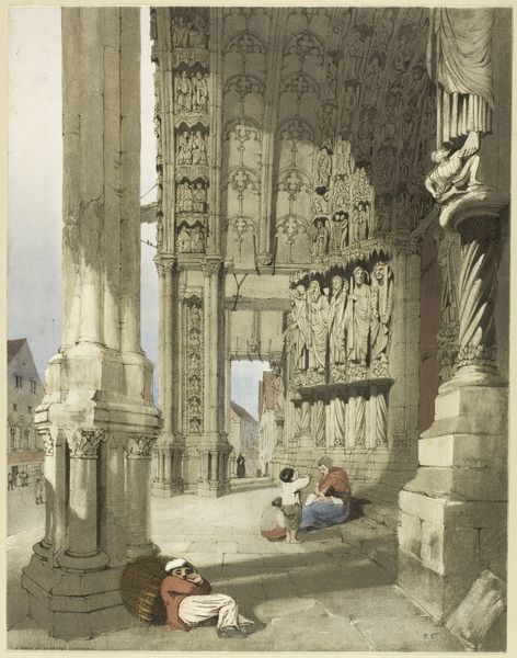Curator: Looking at this artwork, "Thebes. Great Hall at Karnak. Nov. 28, 1838.", a watercolor by David Roberts completed between 1846 and 1849, the first thing that strikes me is its sheer scale. You really get a sense of the monumentality of the place, even in a relatively small watercolor. Editor: The light! It’s as though the temple exhales time, its stones silent witnesses to the ebbs and flows of power. But who built this? For whom did they build it? Curator: Right. We need to consider the context of the creation of such a grand space. Thebes was the religious center of Egypt for many centuries, and Karnak was its largest temple complex, continually added to by successive pharaohs over two thousand years. Enormous resources, materials, and skilled labour would be required for a build of this scale, from quarrying and transport to masonry and decorative art. The power it exudes isn’t just from its physical presence, but its historical position at the centre of social production. Editor: I am thinking about the enslaved individuals who likely contributed their life and effort to its design and creation. Their identities are submerged by time. It speaks volumes about labour exploitation and systemic oppression under hierarchical systems of governance. Curator: And this piece itself reflects 19th-century artistic labour. Roberts’ meticulous application of watercolour attempts to document what was seen, yet in its creation, and as a relatively accessible medium, it’s a piece of art for mass consumption. In turn, the image would have helped shape Western perceptions of the Ancient World. Editor: True. Consider how romantic notions of the 'Orient' functioned to further consolidate power relations with those perceived as ‘other’, feeding into imperial agendas. How much of what we're looking at has been filtered through the prisms of orientalism? How many hands and historical forces contributed to our current image of Thebes? Curator: Indeed. It also begs the question of art's ability to document. There is truth and interpretation, both here. I appreciate seeing these structures not merely as historical artifacts, but also recognizing the materials, means, and conditions that formed them. Editor: And as an act of bearing witness—an exercise in how we are all active participants within the currents of social structures. By looking into this art, we’re peering back in time and into ourselves.