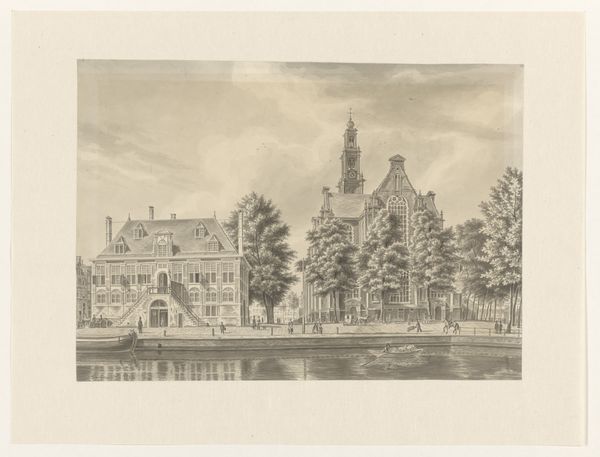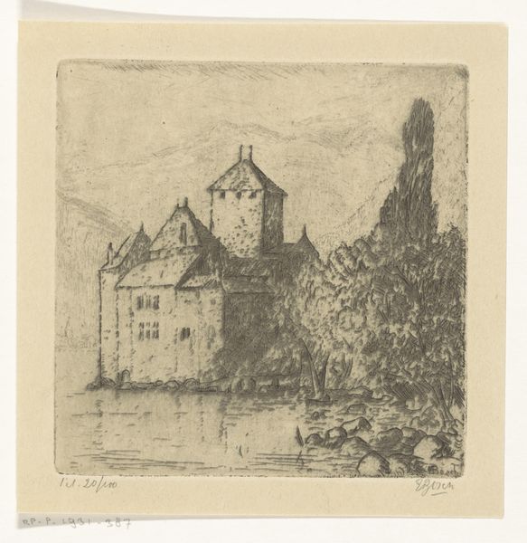 Editor: This is "Kasteel De Cannenburgh," an etching created by R. Cleve in 1922. It’s a rather serene image, a castle reflected in still water. The etching technique gives it a slightly grainy texture. What's your take on this piece? Curator: This etching really speaks to the romantic idealization of the Dutch landscape in the early 20th century. The Cannenburgh Castle, a historical landmark, is presented here almost as a fairytale object, divorced from its actual complex history. Editor: Fairytale is a great word! You mean, like, overlooking the real people who lived and worked there? Curator: Exactly! Prints like these were widely circulated, shaping public perception. Consider how the artist chooses this specific viewpoint, obscuring any signs of modern life, industry, or even agricultural activity that would have been present in the region. It emphasizes the aesthetic, picturesque qualities. Does that strike you as a deliberate choice? Editor: Definitely deliberate! It's like selling a dream. Was there a specific movement that pushed this "dream"? Curator: Think about the rise of tourism, historic preservation movements, and even national identity formation in that era. Images like these reinforced a romanticized vision of the Netherlands, subtly promoting ideas about heritage and belonging. Editor: So, it’s more than just a pretty picture; it's participating in building a national narrative. Curator: Precisely. It makes me consider the role of art in constructing and perpetuating cultural values, which is particularly relevant even today in art and its power to manipulate ideology. Editor: It’s incredible to think about how an image can be part of this much larger conversation. I'll never look at landscape art the same way again!