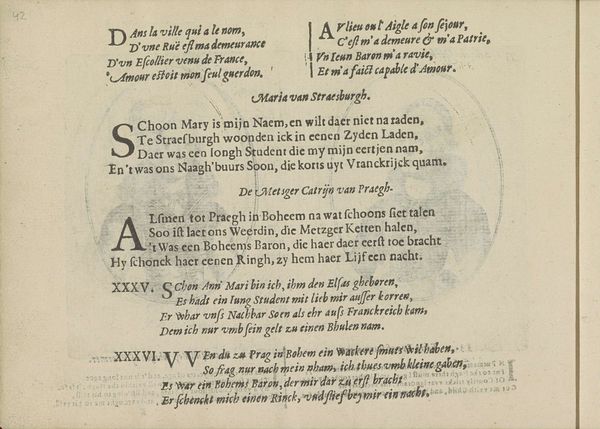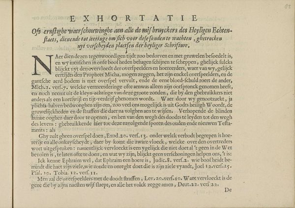 Curator: This artwork, dating back to 1572, is titled "Tekst over de Geseling van Christus." It’s a print, most likely from a book, executed in typography on paper by Domenico Mancini. My immediate impression is of hushed reverence. The starkness of the text against the paper invokes a contemplative mood. Editor: I see a social commentary—it's interesting how the print medium allows the narrative to be distributed more widely. The text itself, being over "The Flagellation of Christ," highlights the way political narratives frame the event, shifting culpability. The stark typography adds to that sense of somber reflection. Curator: Yes, typography itself can be deeply symbolic. Here, the disciplined, almost relentless rows of text, remind me of the inexorable workings of fate, or even divine law. It lacks ornate decoration, thus centering the narrative content above aesthetic display. Editor: Agreed, the lack of embellishment drives the point home. But that makes me wonder, who was the intended audience? A more learned elite? Was this image meant to incite reflection among civic leaders regarding law and judgment during that era? Curator: It could function as a moral instruction piece—drawing a sharp contrast between righteous suffering and judicial corruption. Think of the early Renaissance fascination with classical rhetoric; Mancini is, in essence, using text as his brush, manipulating viewers’ perspectives with strategic pronouncements and direct language, compelling them to confront difficult moral decisions. The Latin would certainly indicate an educated audience, confirming your assessment. Editor: It shows us, I think, the potency of printed text as an influential element of Reformation era thought. The narrative control exercised here reveals the sociopolitical underpinnings of religious depiction and their continuing manipulation of audiences. Curator: Indeed. Ultimately, this artwork invites us to think critically about historical and cultural context by connecting word and symbol through the psychological prism of a pivotal biblical scene. Editor: A great point—it's a crucial piece that uses history itself as a tool for influencing moral conduct.