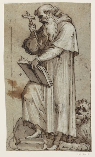 Curator: Here we have plate 41 from the portfolio "Spanish Colonial Designs of New Mexico", a watercolor and ink drawing believed to be created between 1935 and 1942 by an anonymous artist. It's titled "Santa Barbara". Editor: There’s a somberness about this piece, wouldn’t you say? The limited palette emphasizes the austerity, almost like a woodblock print attempting to capture depth with stark shadows and stylized figures. Curator: It's interesting to think about this image as part of a portfolio intended to showcase Spanish Colonial design. The artist likely viewed the churches and their associated iconography in Santa Barbara, New Mexico, as resources, pulling elements for reproduction and study, or possibly for marketing the aesthetic as authentic. Editor: And we should note how Santa Barbara, as a historical figure, gets reimagined here. Stripped of her typical radiant attributes, she is made solemn, holding a chalice with the cross; there’s an unusual austerity here, perhaps reflecting the realities and material conditions of New Mexico during that time period. We can ponder on the labor involved in reproducing Catholic iconography as part of regional cultural affirmation. Curator: That’s insightful. This process highlights how cultural symbols are consumed and reinterpreted depending on the context and resources. We see how religious imagery, far from being static, is constantly renegotiated through its making and reproduction. It forces one to consider the artist’s own access to materials, the local understanding of craftsmanship, and whether this work, in its replication, becomes a commodity or a symbol. Editor: Exactly. The political and cultural context also demands investigation: Is it an homage, an appropriation, or a commentary? How might its display reinforce, or even subvert, dominant narratives about culture in New Mexico? It's such a rich visual statement about cultural dialogue during that time. Curator: A dialogue expressed through line, form, ink, and watercolor… quite compelling, especially knowing so little about its creator and the circumstances of its creation. Editor: Yes, pondering the complex intersection of culture, gender, religious iconography, and regional experience embedded in the artwork has made for some deeply felt reflection.