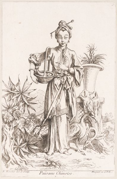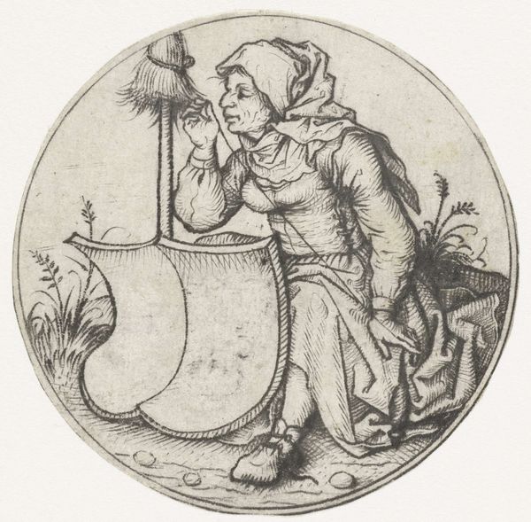 Curator: Look, this print by Martin Schongauer from around 1480-1490, is aptly called "Shield with a Unicorn, Held by a Lady." It’s currently residing here at the Art Institute of Chicago. It's just magnificent, isn't it? Editor: Absolutely, the most immediate impression is this enchanting dreamlike quality. Its compact circular form just radiates elegance—like peering into a perfectly captured Renaissance reverie. Curator: And a reverie laden with symbolism I think. This engraving—done with such astonishing precision in the hatching—invites contemplation. Schongauer uses line so deftly; see how he conveys the textures of fabric and flora. Notice the woman. Editor: Her delicate composure! Seated so serenely. You get the impression that this young woman embodies both purity and strength. Her calm face gives an impression of contained emotions that the Unicorn amplifies so wonderfully. Curator: I read that unicorns were potent symbols. Allegories, even. Some suggest chastity, others connect them to Christ himself! That coat of arms on her shield must denote family lineage—power intertwined with virtue. She seems more to display it than need its protection. Editor: Interesting. What strikes me as a formalist are the visual relationships and how they convey a certain narrative tension. How she holds a plant versus holding the shield. There is this inherent tension between her beauty and bearing, her dress, the objects and her composed look and position within the drawing that leads my eye through a dance of discovery. The light and shadow play a critical role here, defining forms while enriching their symbolism. Curator: Precisely! It’s this dance between image and ideal that captivates, isn't it? A glimpse into the moral and aesthetic values that animated the Northern Renaissance world! And it continues to resonate, all these centuries later! It gives you a warm comforting feeling. Editor: Indubitably. I come away seeing this more as an opportunity. If there is anything it displays to me today is how line, shadow, bearing, composition, texture, etc., if given thoughtful execution, an image from the Northern Renaissance period such as this engraving is an exemplary instance where art itself can become revelation.